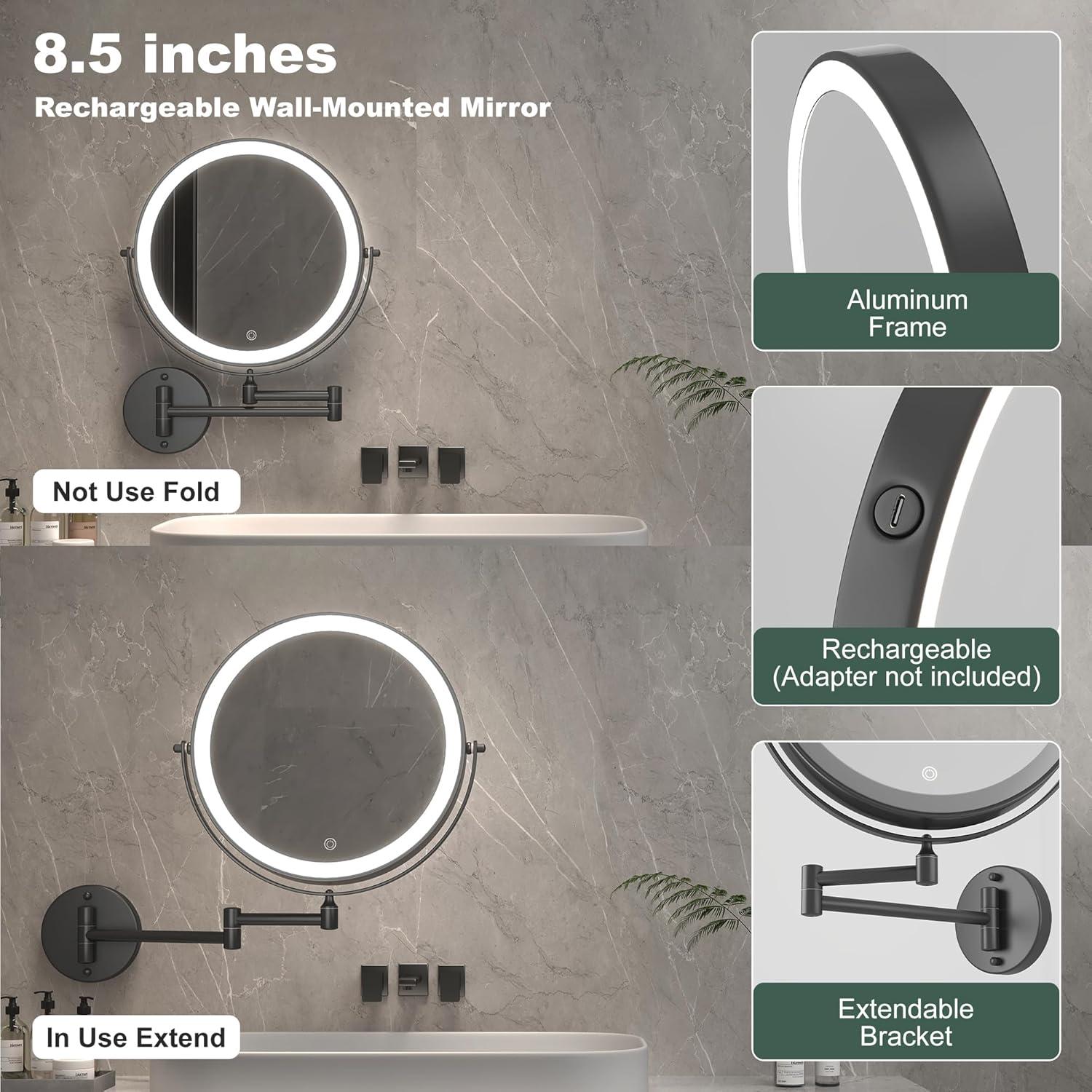 Hasipu 10-Inch Wall Mounted Makeup Mirror with Magnification, Rechargeable 3000 mAh Vanity Mirror with Lights, Bathroom Mirror with Dimmable Brightness, 3 Lighting Modes, Extendable Arm, Chrome(Black)
