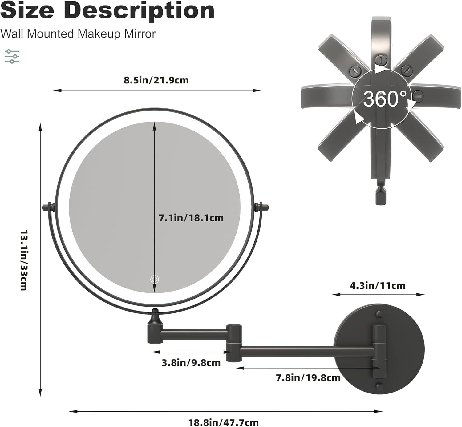 💫𝐄𝐱𝐭𝐞𝐧𝐝𝐚𝐛𝐥𝐞 𝐀𝐫𝐦 𝐰𝐢𝐭𝐡 𝟑𝟔𝟎-𝐝𝐞𝐠𝐫𝐞𝐞 𝐑𝐨𝐭𝐚𝐭𝐢𝐨𝐧: The extendable arm reaches up to 19.7 inches, allowing you to position the mirror at the perfect angle for your routine. The swivel mirror rotates 360 degrees, offering a full range of motion to find your ideal viewing angle. When you're done, you can fold it back against the wall to save space. This versatility makes it ideal for any bathroom or vanity setup.