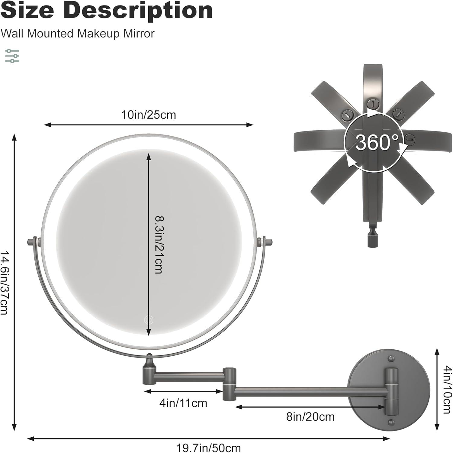 imageHasipu 10Inch Wall Mounted Makeup Mirror with Magnification Rechargeable 3000 mAh Vanity Mirror with Lights Bathroom Mirror with Dimmable Brightness 3 Lighting Modes Extendable Arm ChromeBlack
