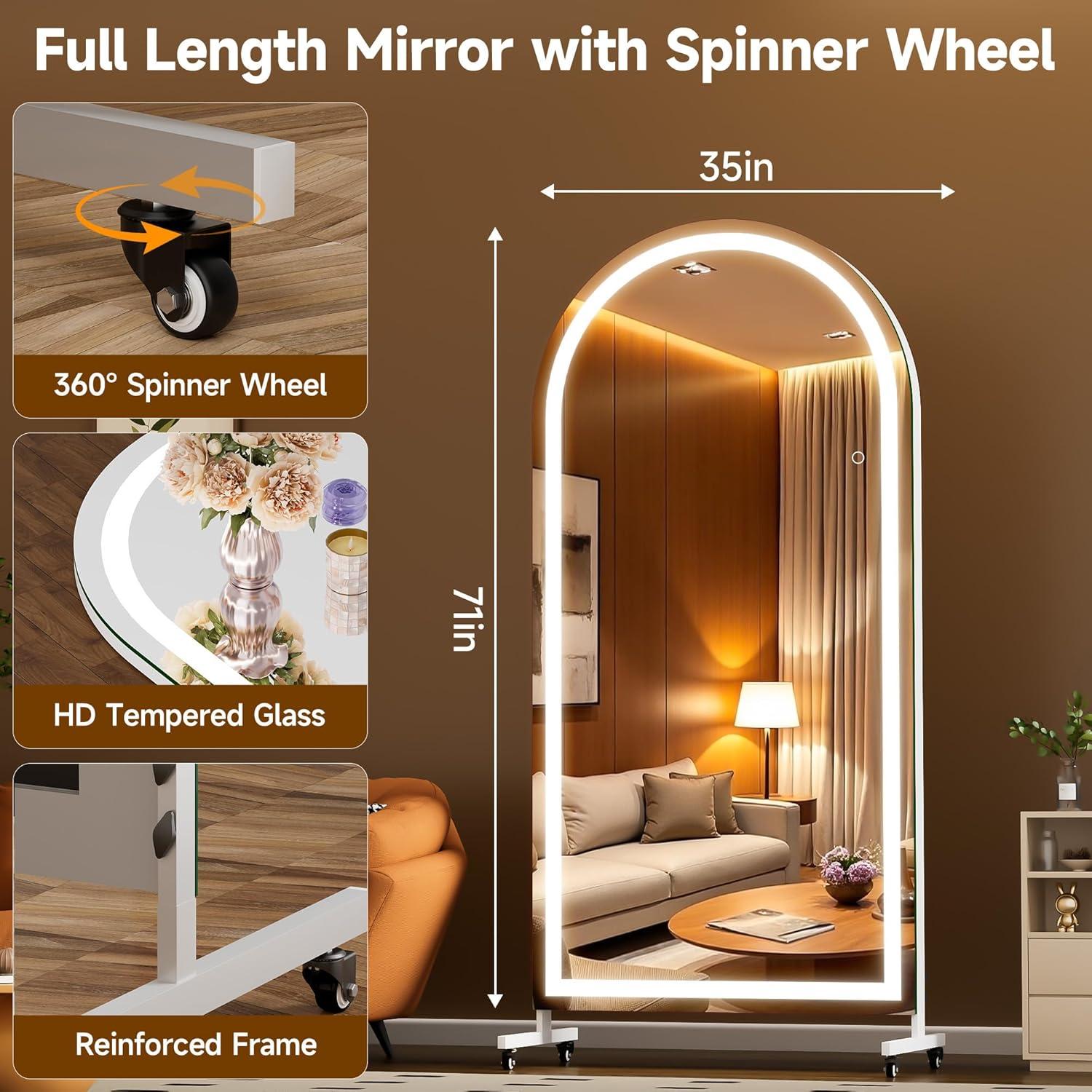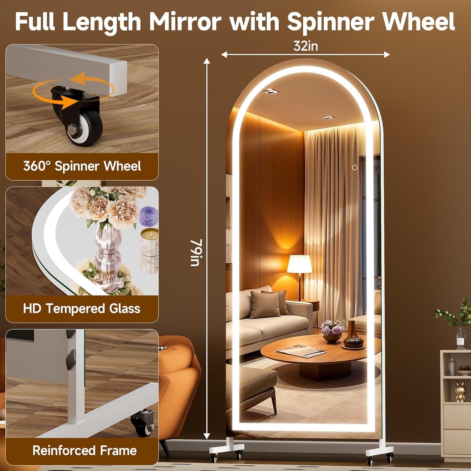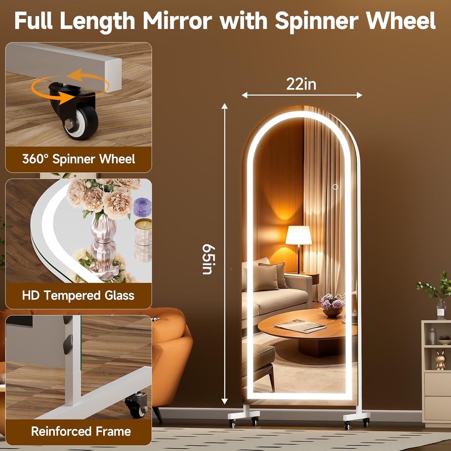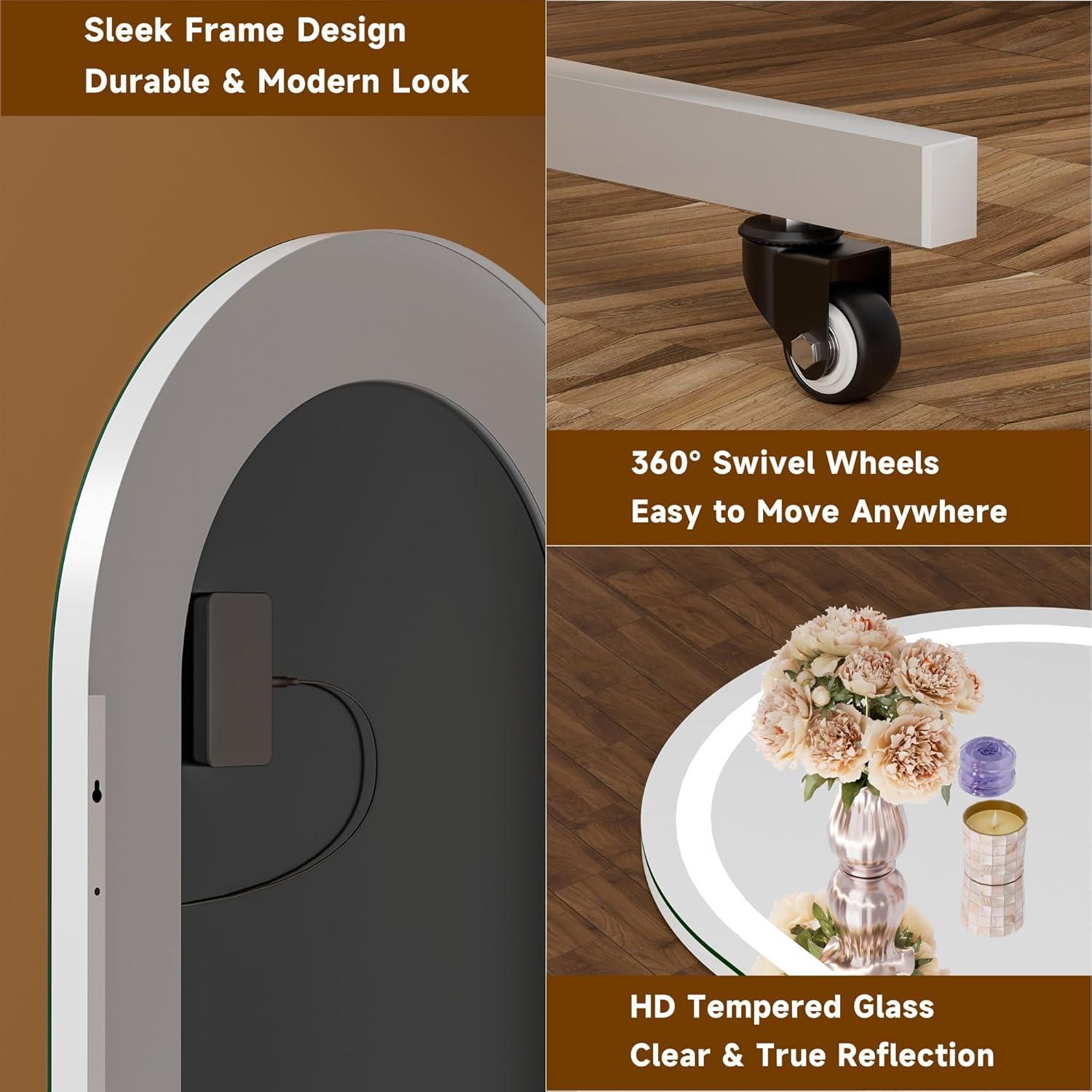360° Swivel & Rolling Wheels – Equipped with 4 universal wheels and secure locks, this LED full-length mirror moves effortlessly between rooms. Easily adjust the angle or lighting for your best reflection.