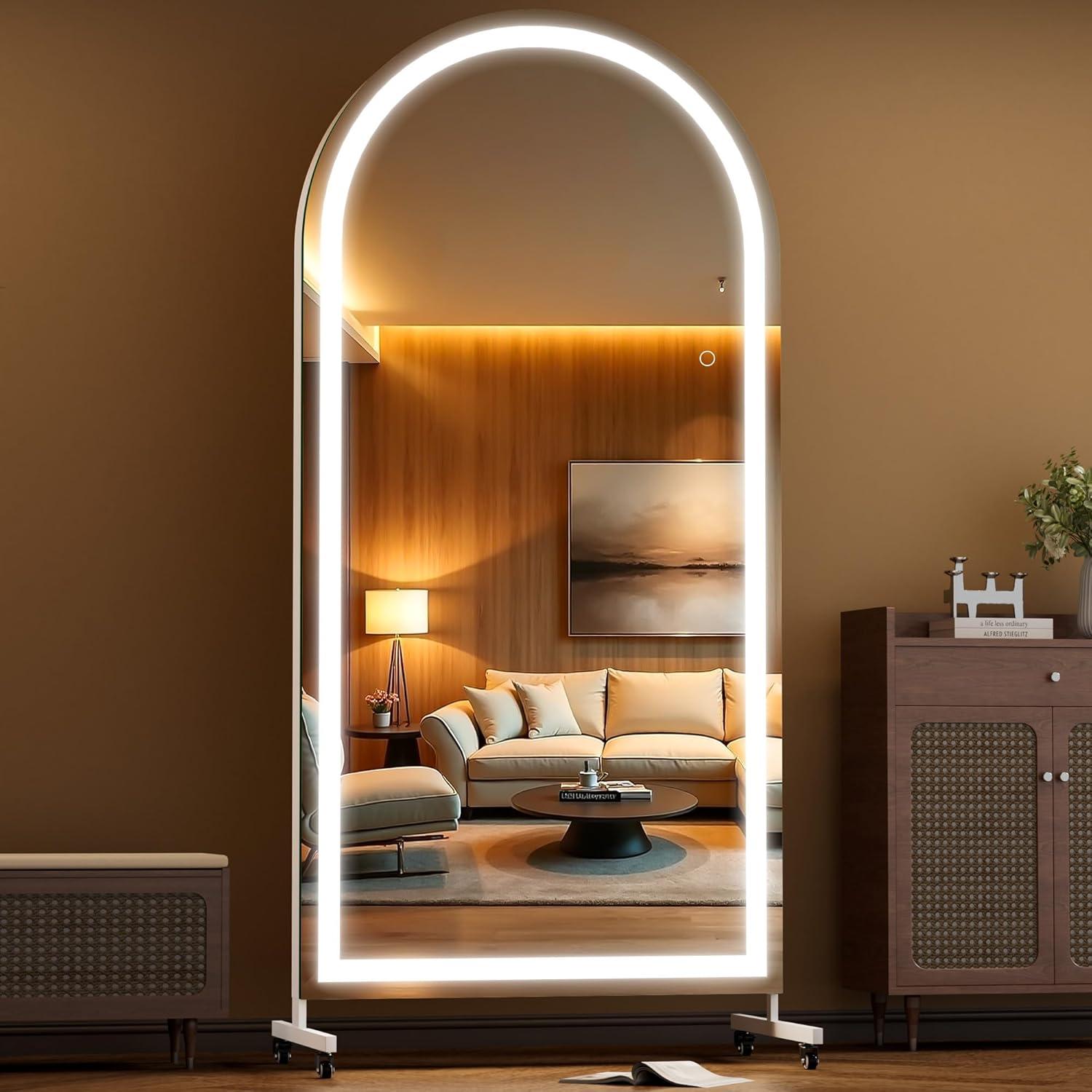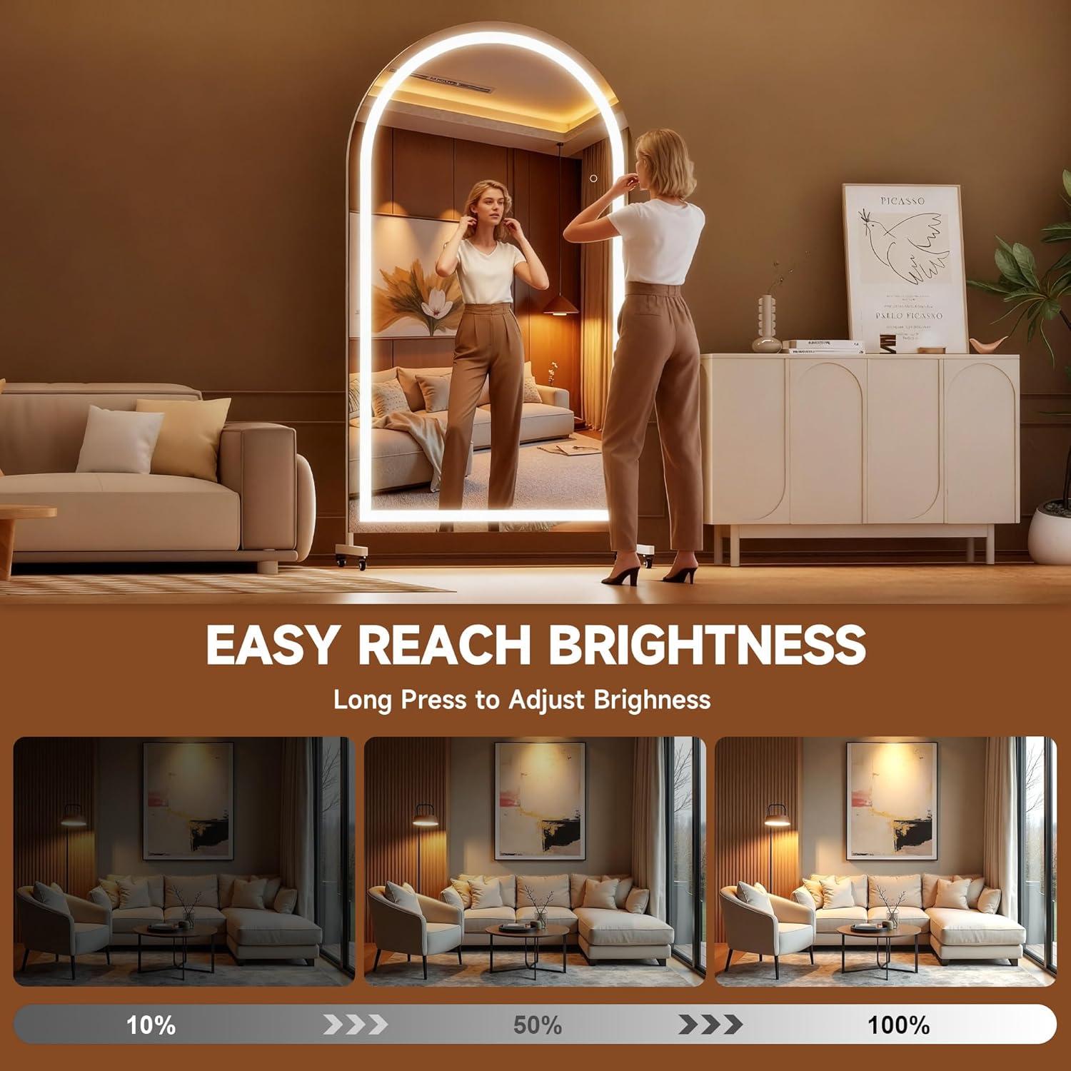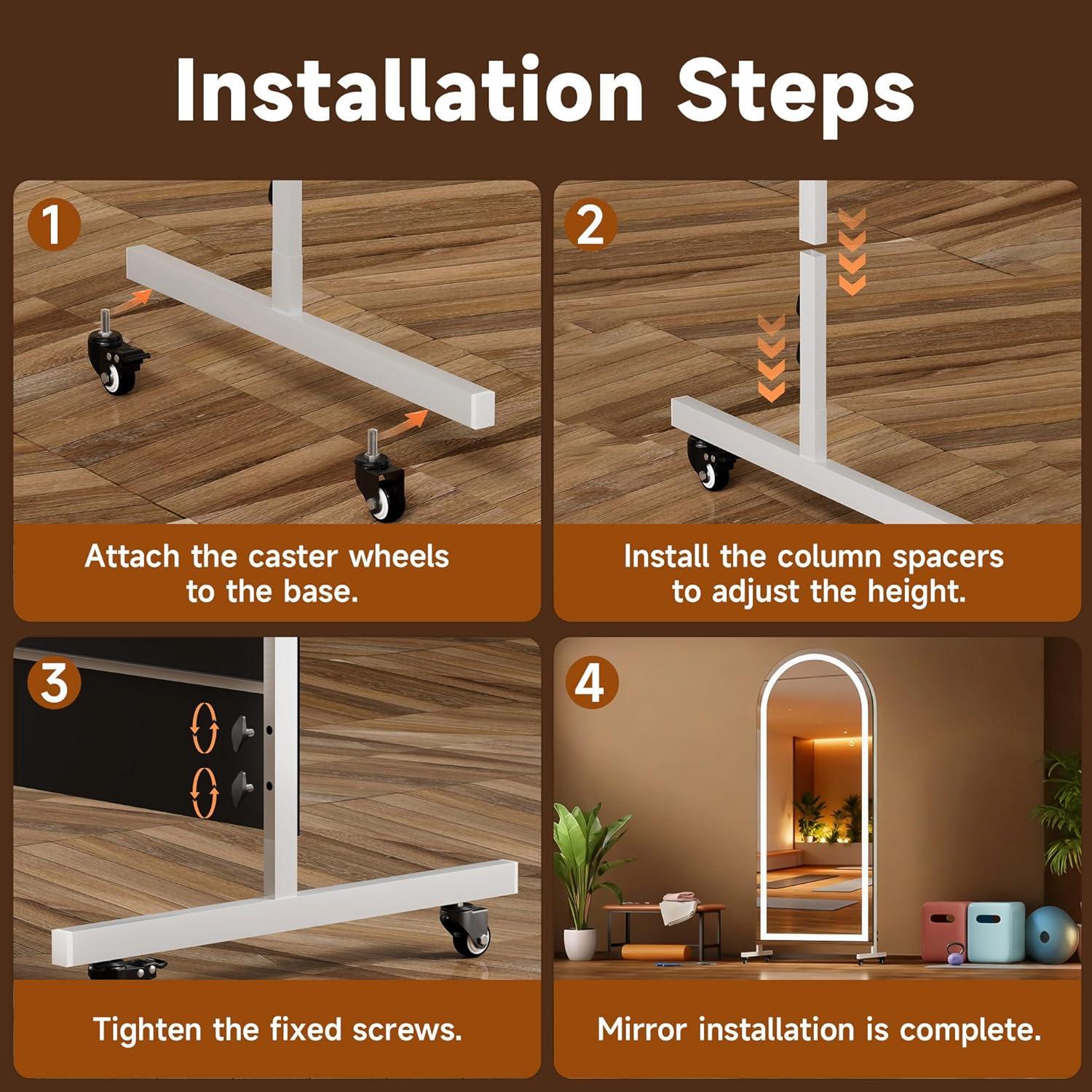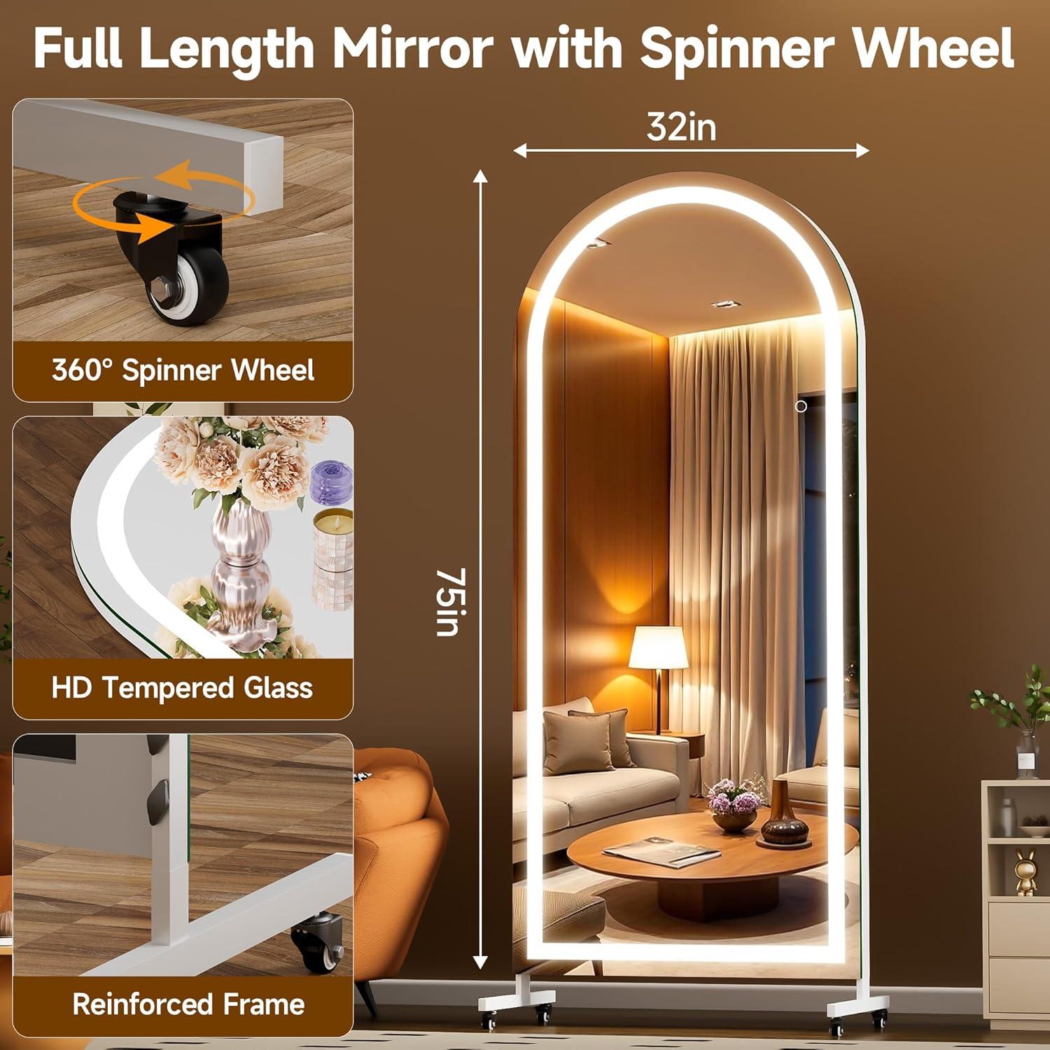 360° Swivel & Rolling Wheels – Equipped with 4 universal wheels and secure locks, this LED full-length mirror moves effortlessly between rooms. Easily adjust the angle or lighting for your best reflection.