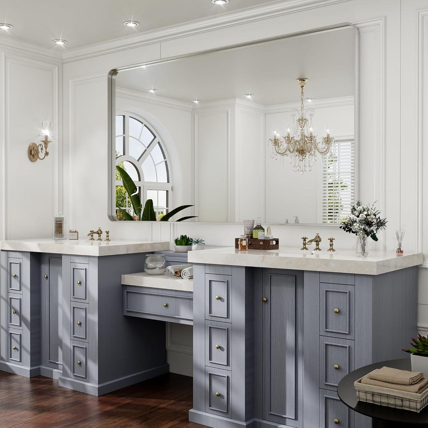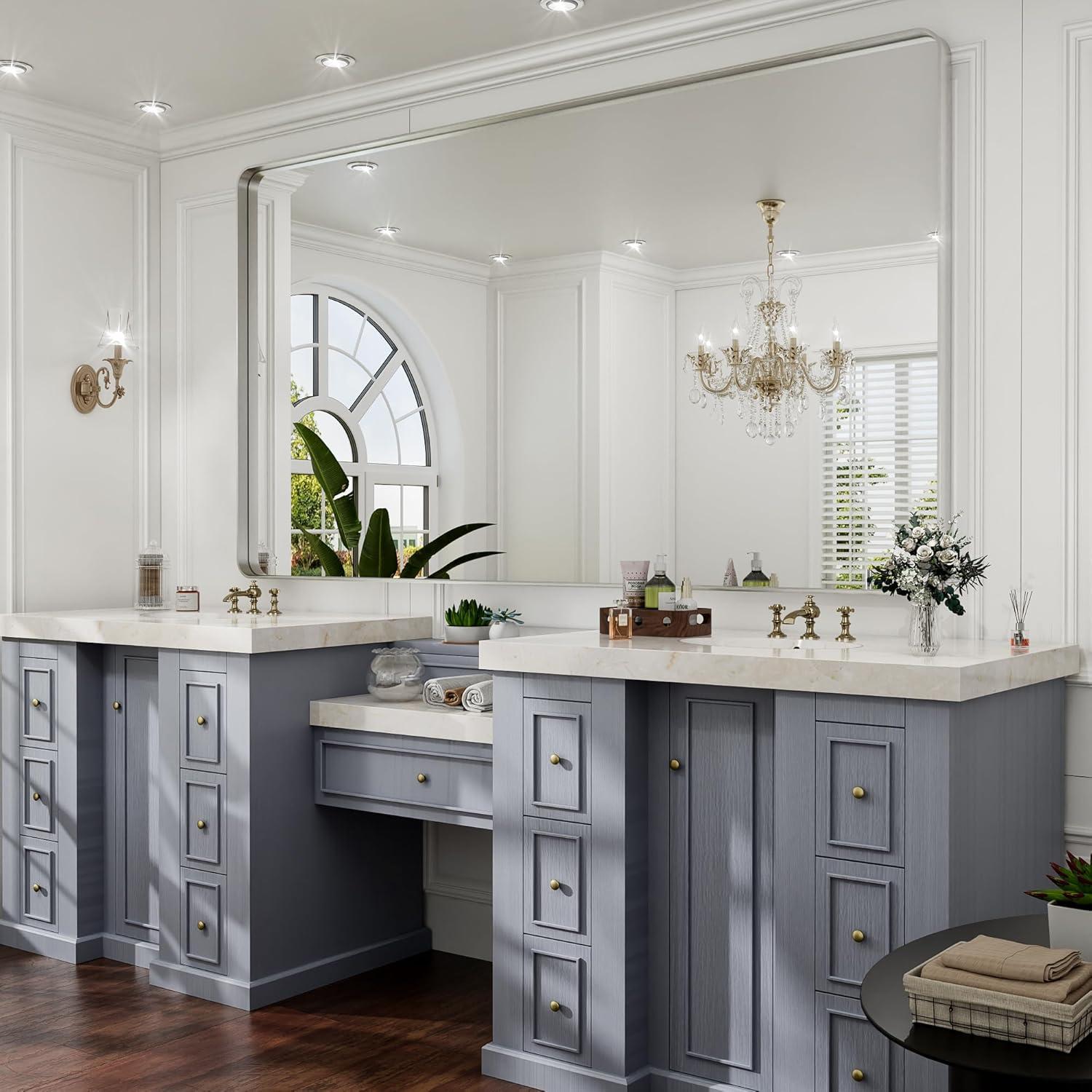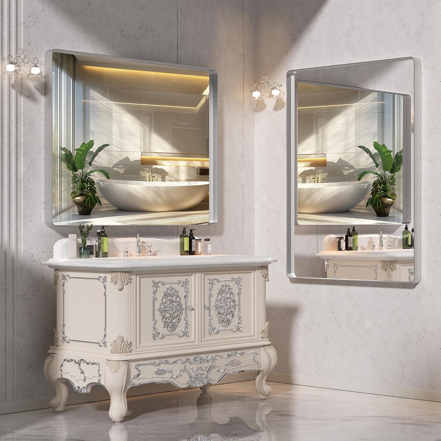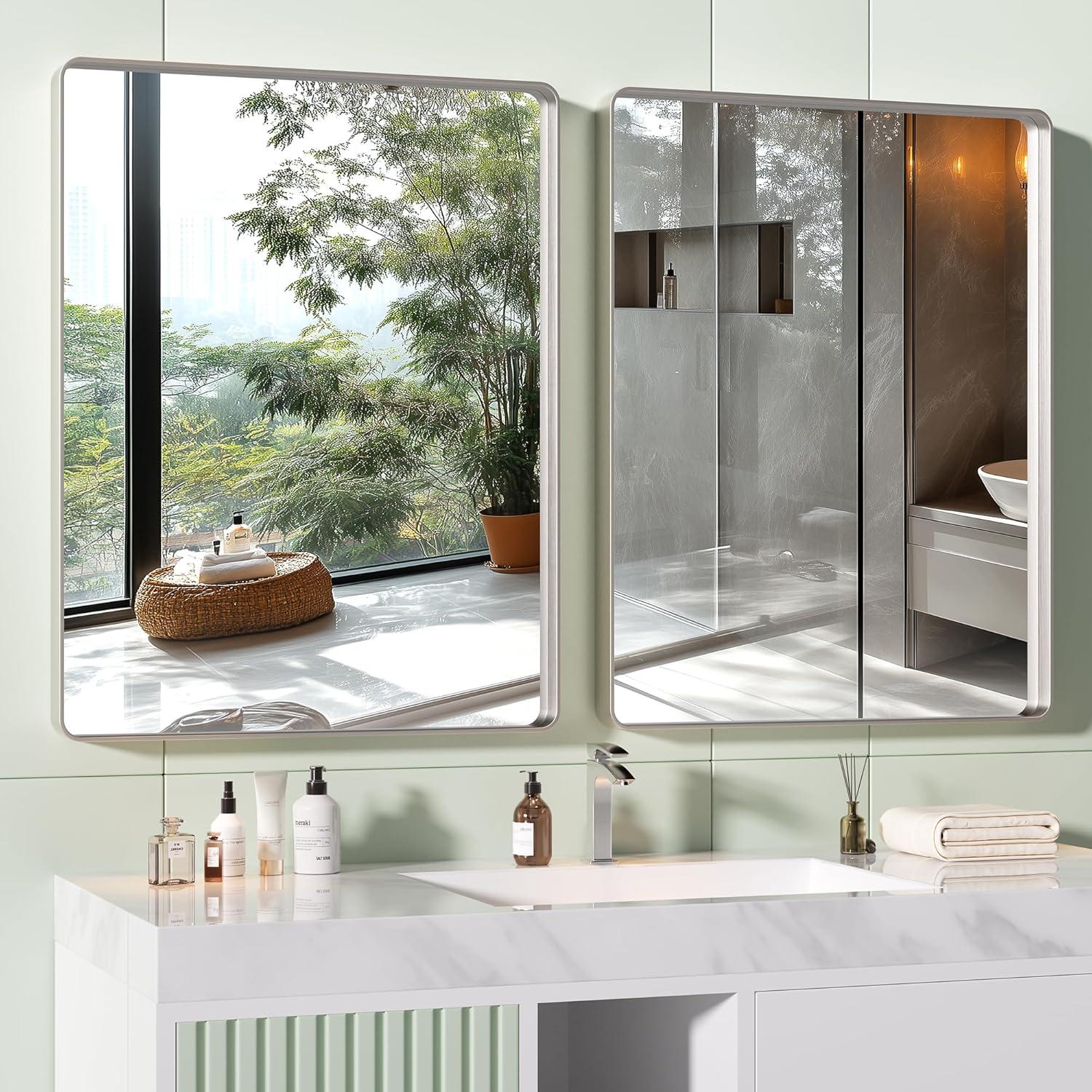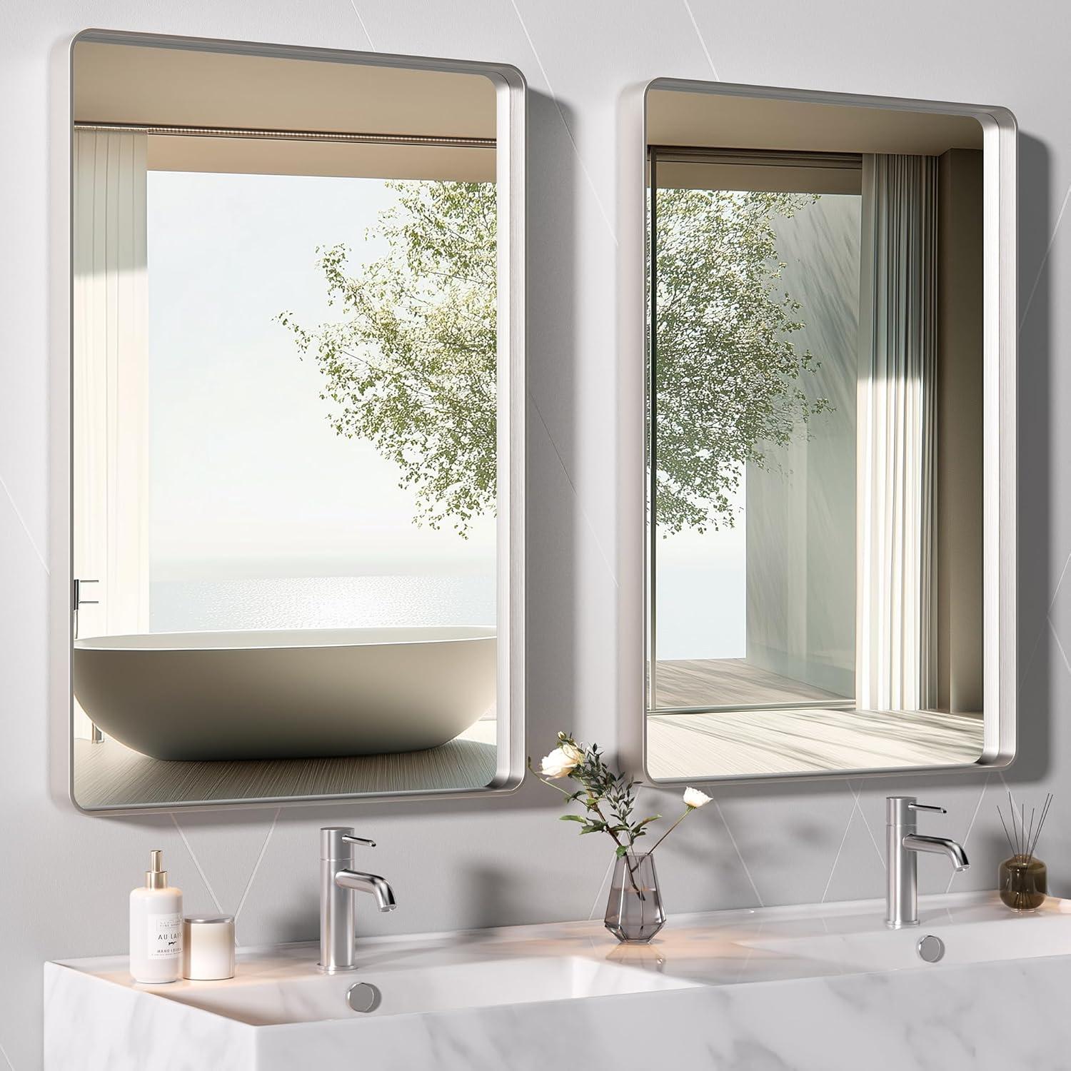Hasipu Black Bathroom Over Sink Mirror 41x21 Inch Rounded Rectangle Vanity Mirror Metal Framed Wall Mirrors Anti-Rust Surface Mount (Hangs Horizontal or Vertical)(Silver)