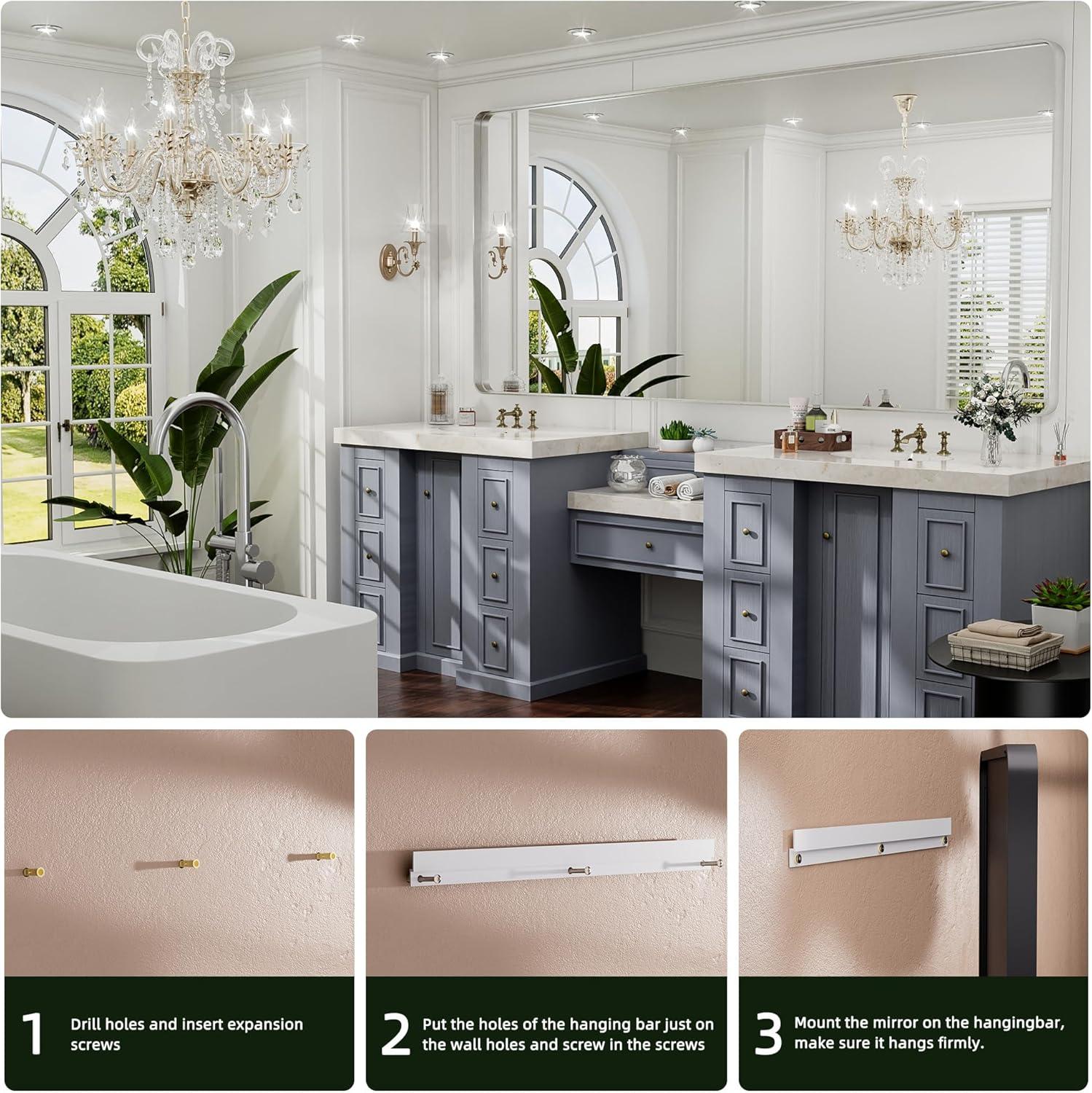 【EASY TO INSTALL】:This lightweight mirror comes with hanging strips and expansion screws, simply fasten the hanging strips to the wall with the expansion screws and snap the groove of the mirror onto the hanging strips. The mirror can be hung horizontally or vertically on all four sides.