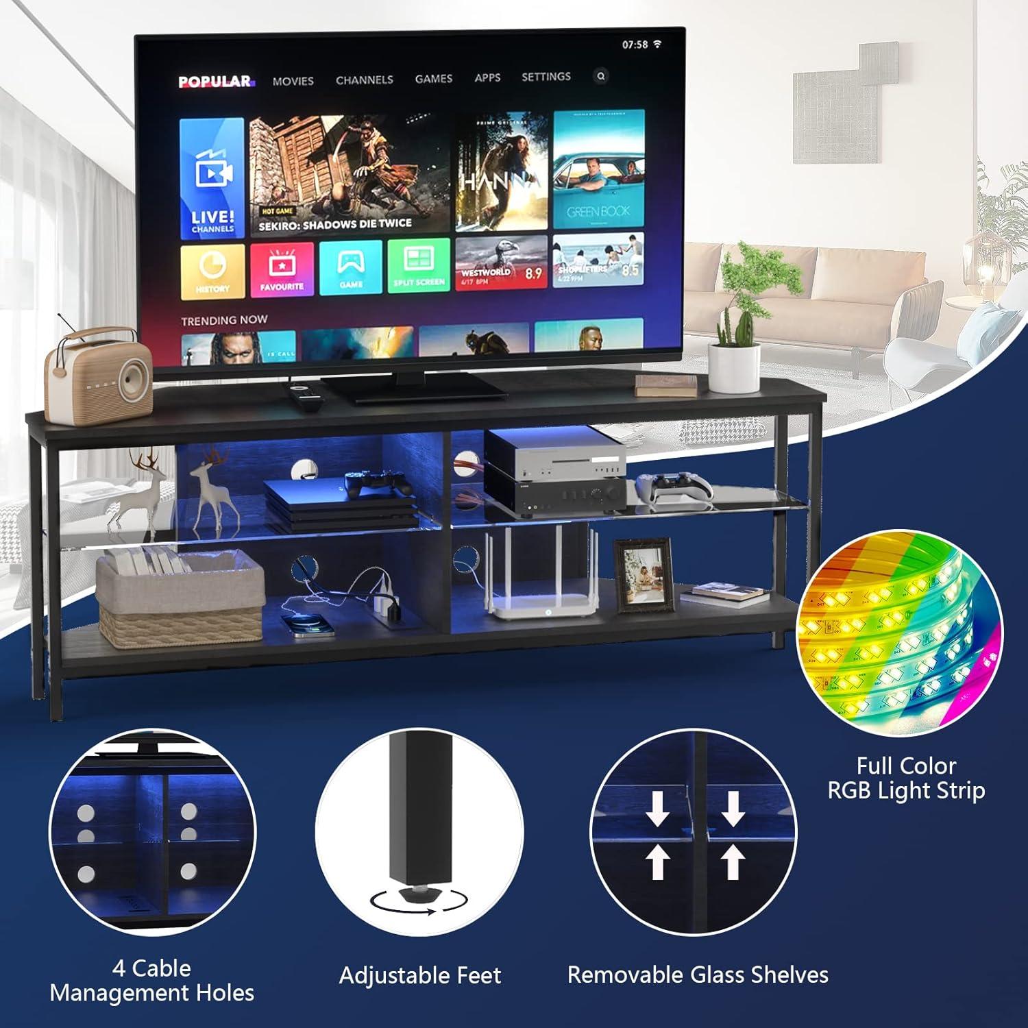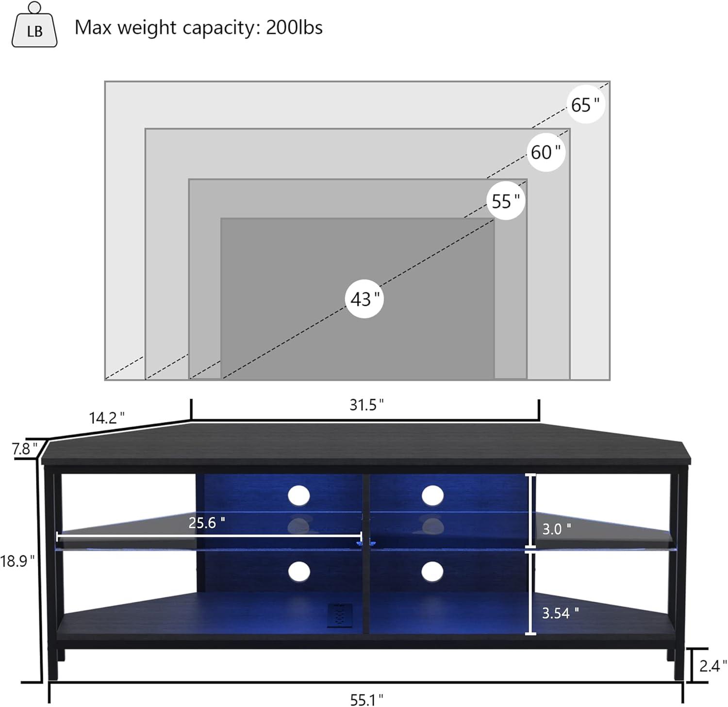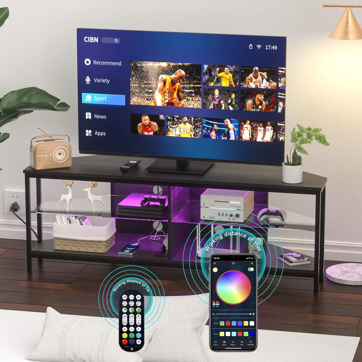Hasipu Corner TV Stand for 55 Inch TV, Corner TV Stand with LED Lights and Power Outlet, Corner Entertainment Center with 4 Open Storage Spaces and Adjustable Glass Shelves, Black