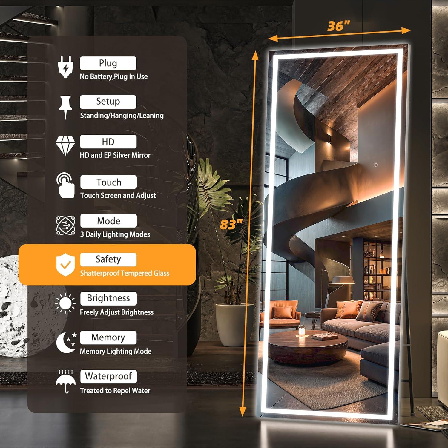 【Super Bright LED Floor Mirror】Adopt 180 LED beads strip, light more concentrated and brighter. Energy-efficient with 50,000 hours lifetime. Enhanced lighting sources designed to make the mirror bright enough for you to do makeup, skin care, shaving and dressing up. Super bright.