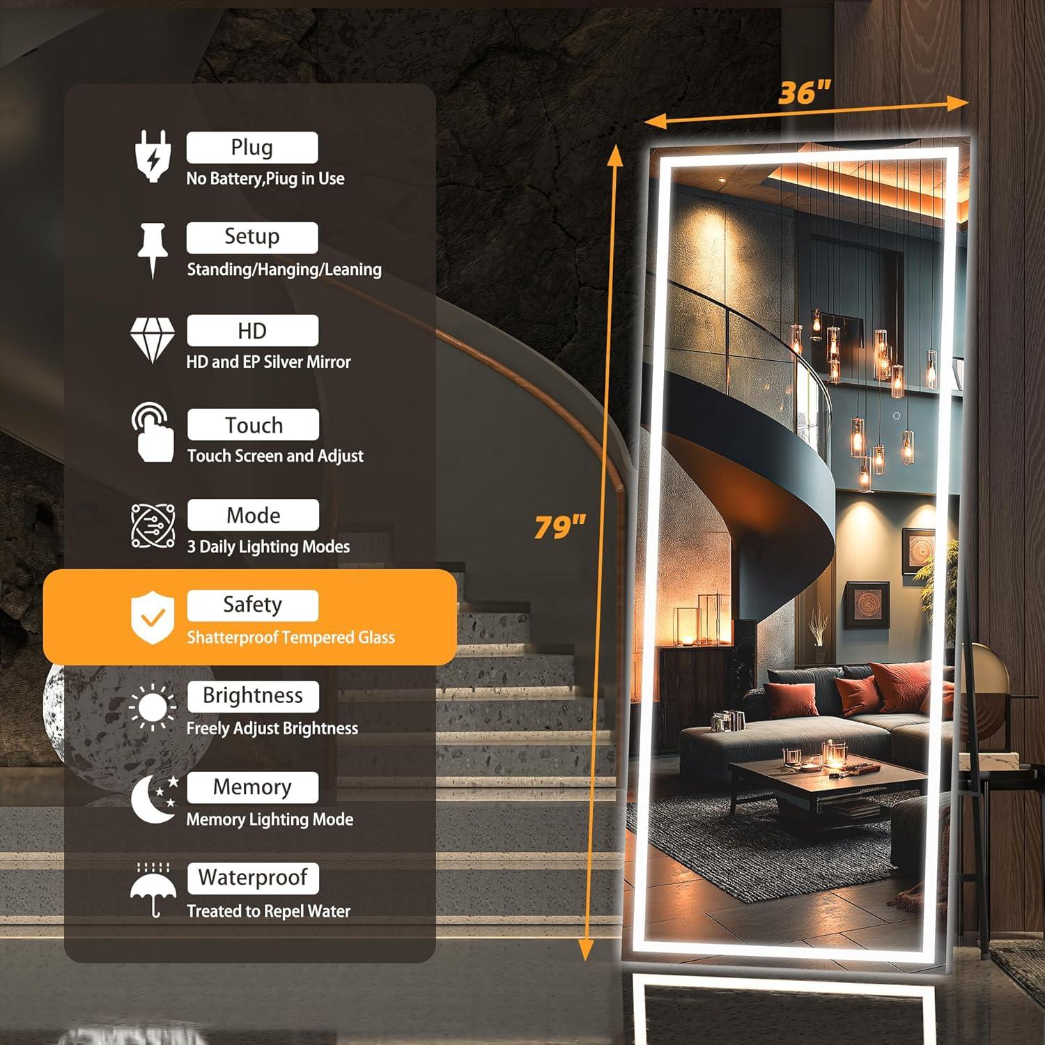 【Super Bright LED Floor Mirror】Adopt 180 LED beads strip, light more concentrated and brighter. Energy-efficient with 50,000 hours lifetime. Enhanced lighting sources designed to make the mirror bright enough for you to do makeup, skin care, shaving and dressing up. Super bright.