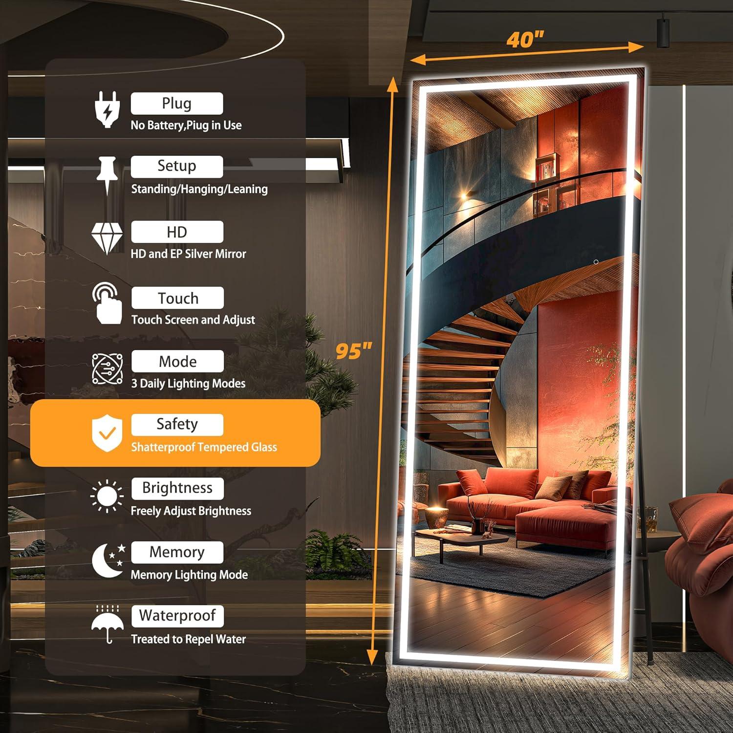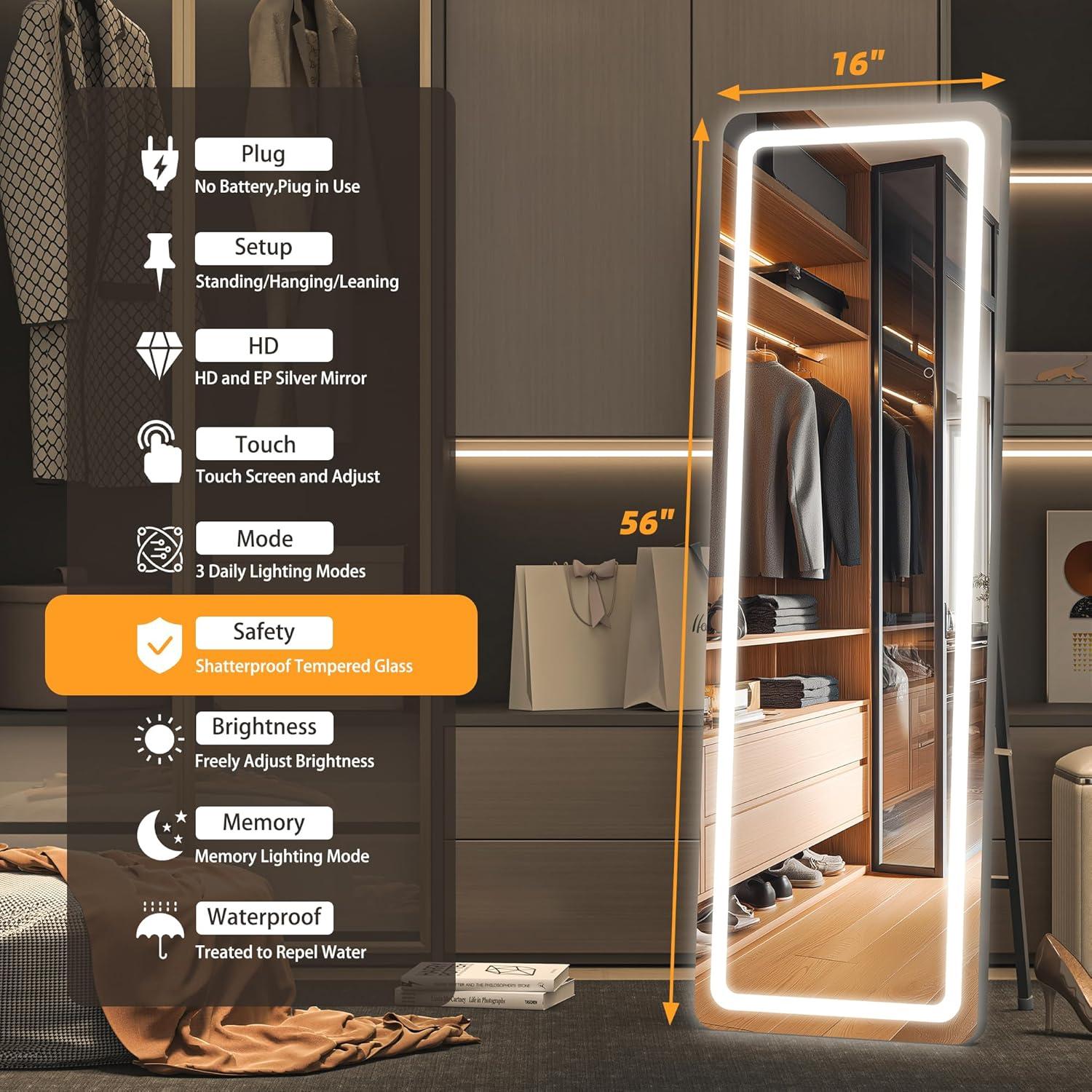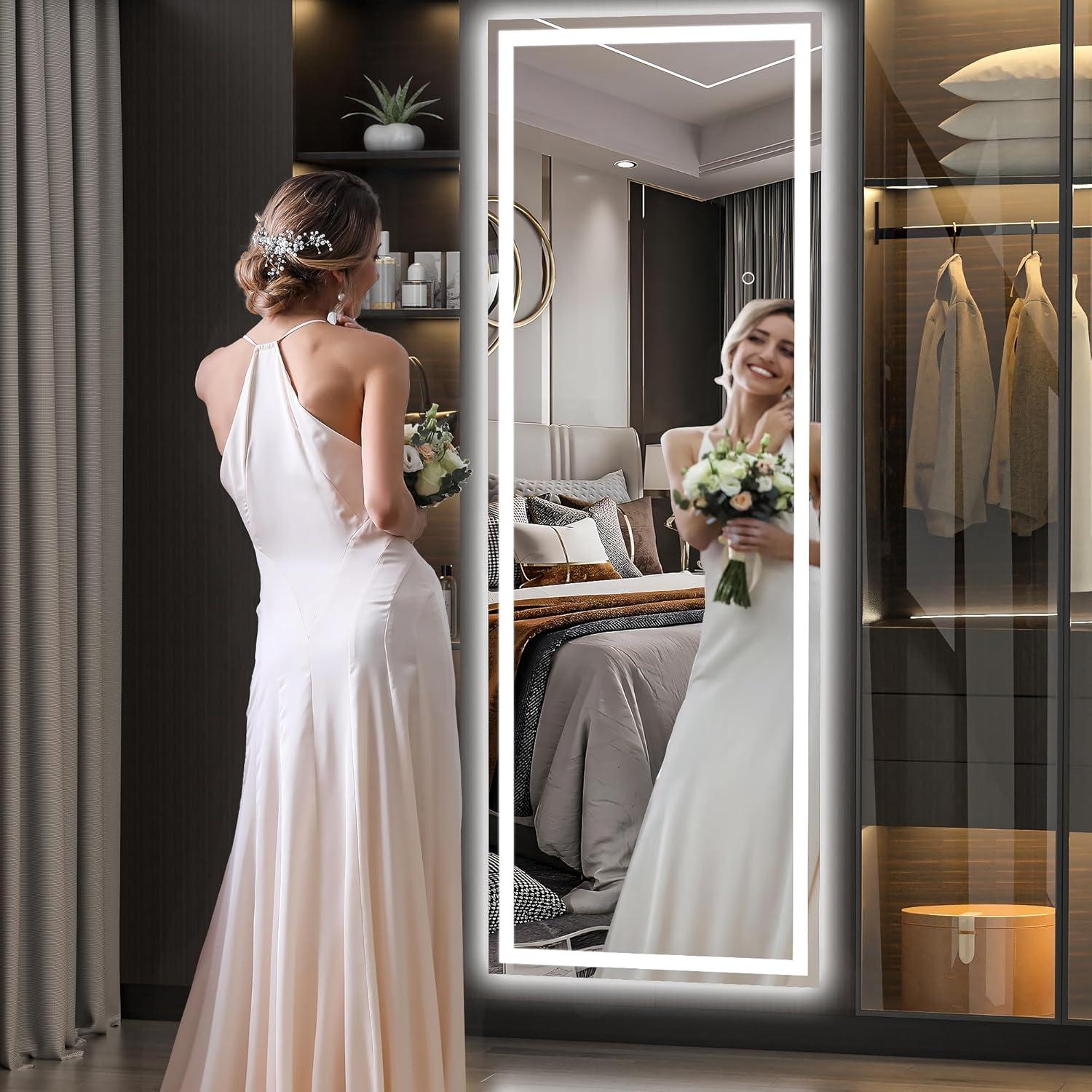 【Dimmable & 3 Color Temperature】This lighted full length mirror is multifunctional. You can press the button to change the color temperatures: Warm(3000K), natural (4000K) and white(6000K). You can also dim the brightness to your comfortable level. All these will be easily controlled by the touch button.