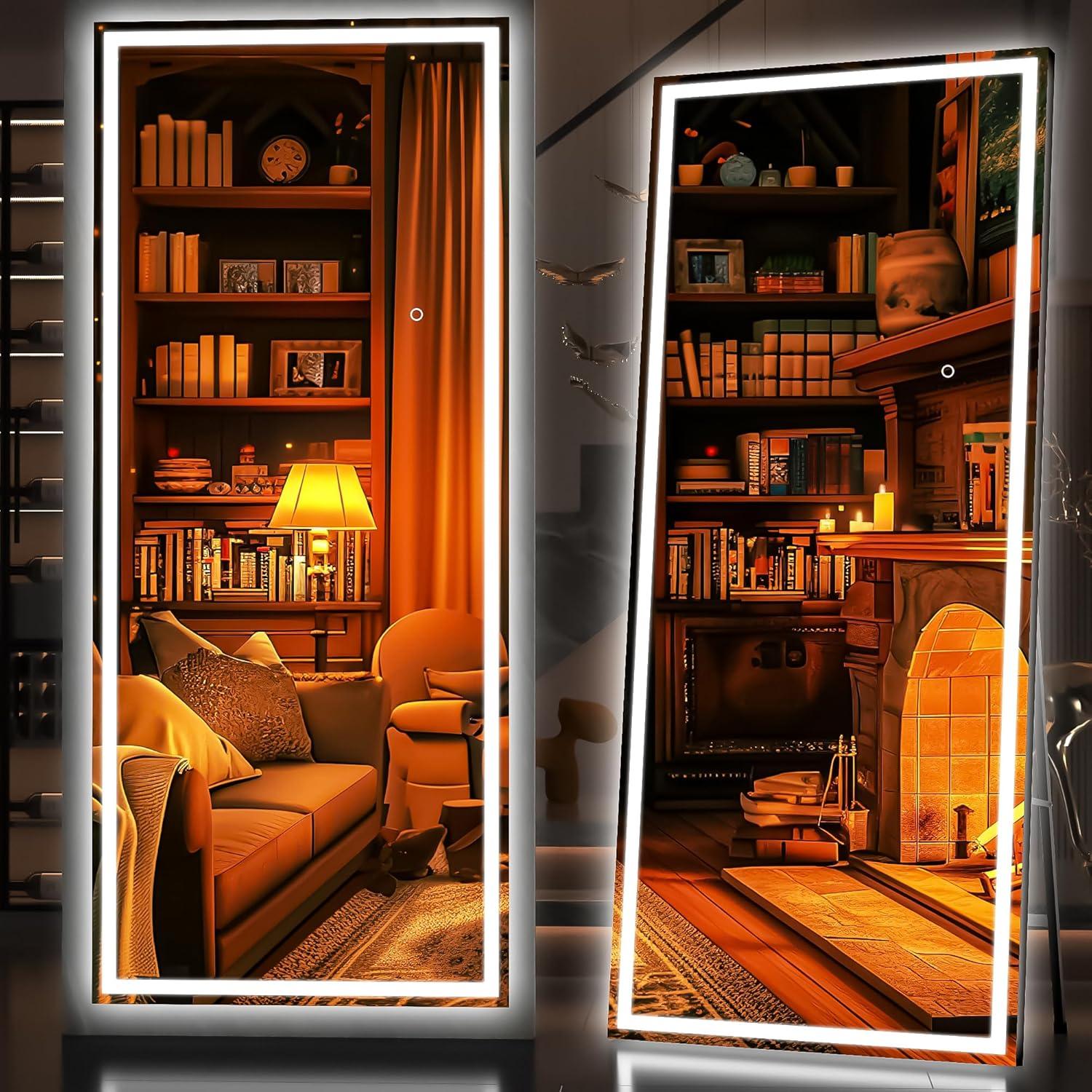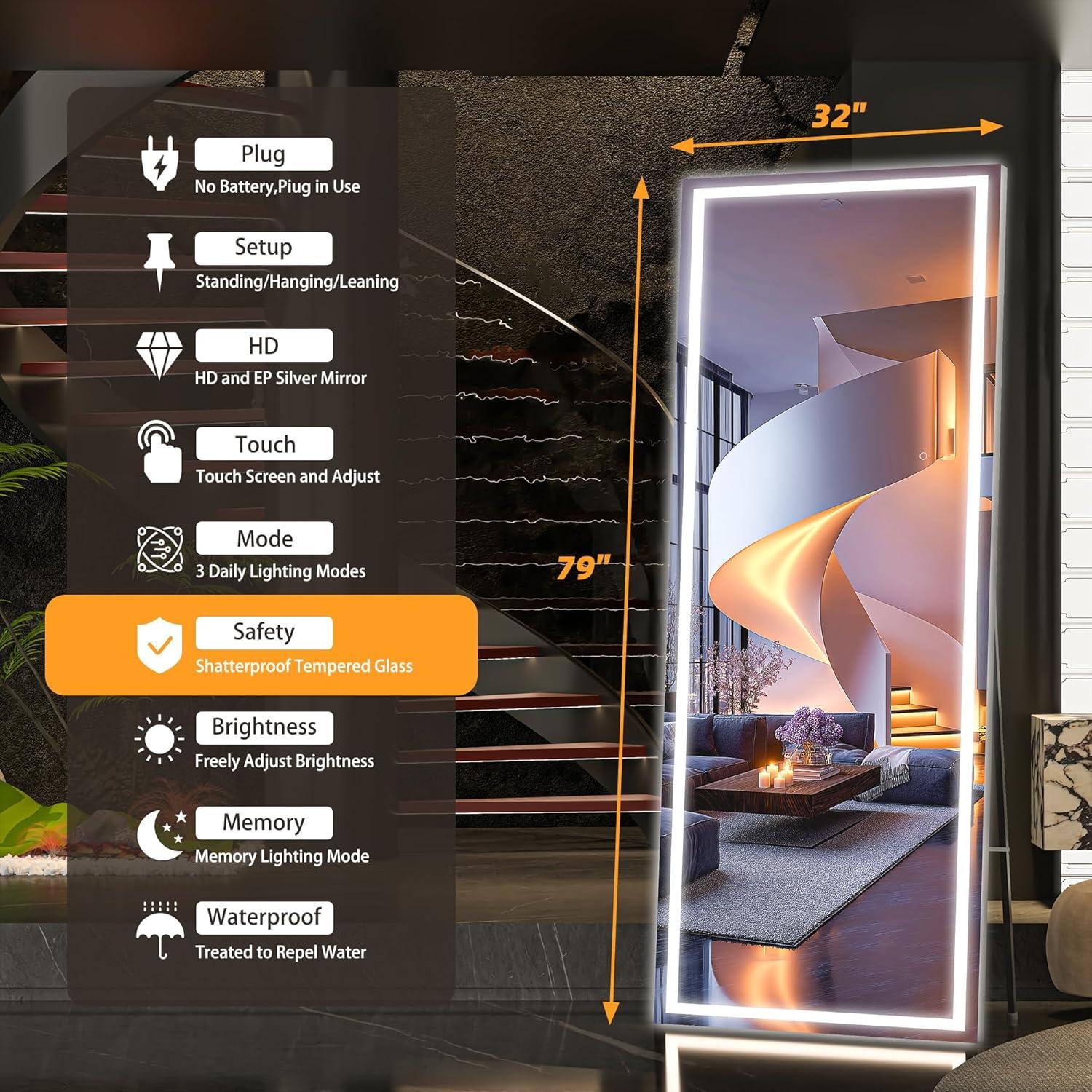 【Super Bright LED Floor Mirror】Adopt 180 LED beads strip, light more concentrated and brighter. Energy-efficient with 50,000 hours lifetime. Enhanced lighting sources designed to make the mirror bright enough for you to do makeup, skin care, shaving and dressing up. Super bright.