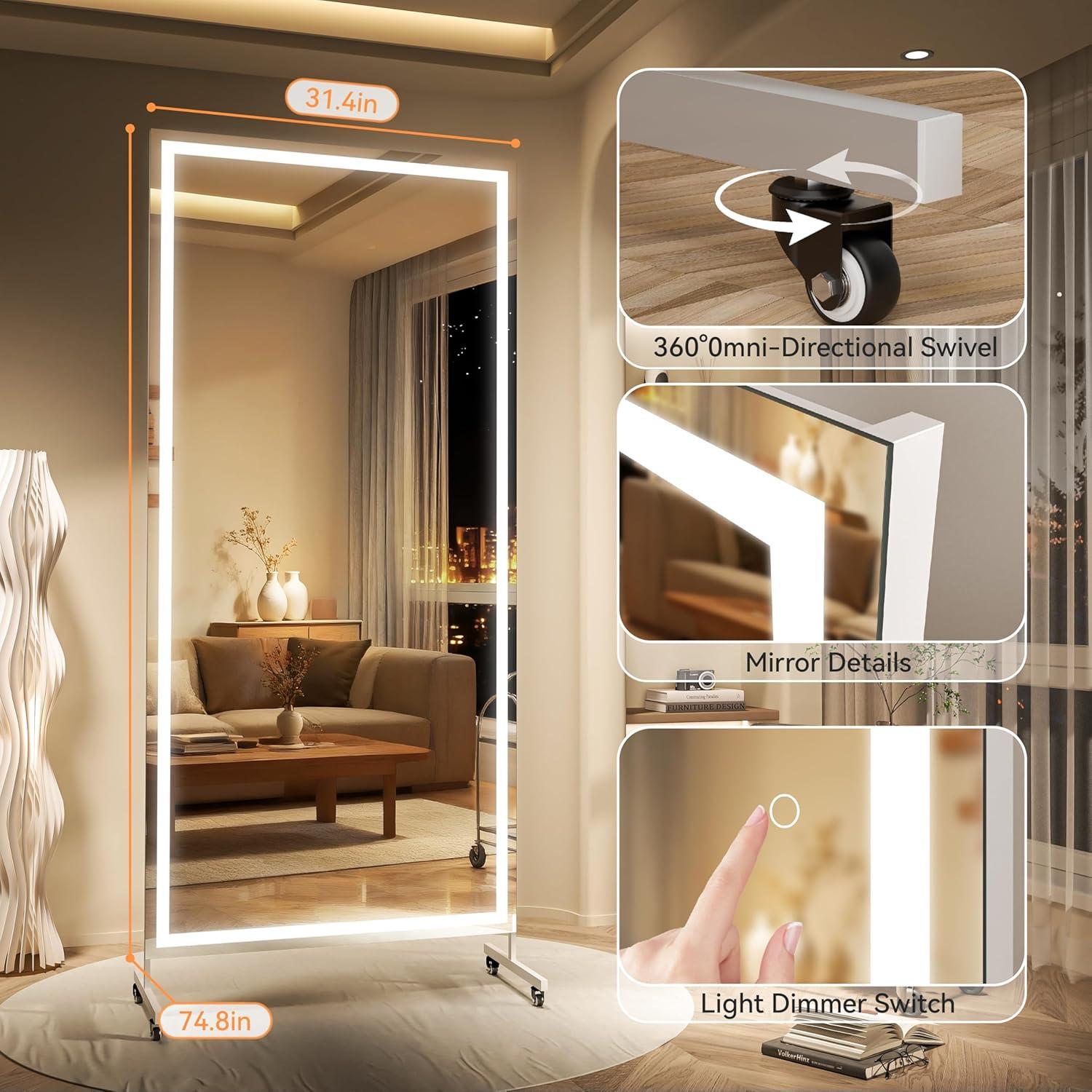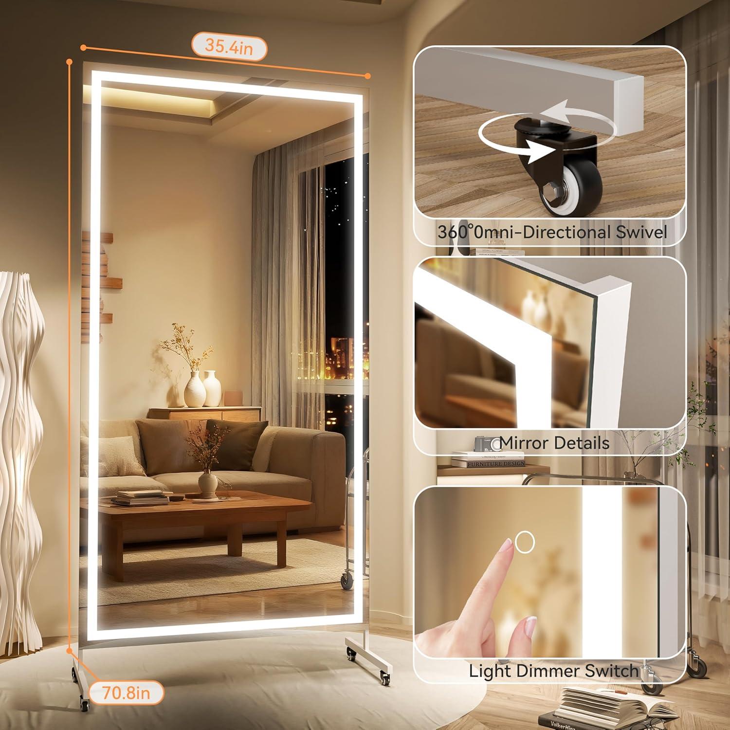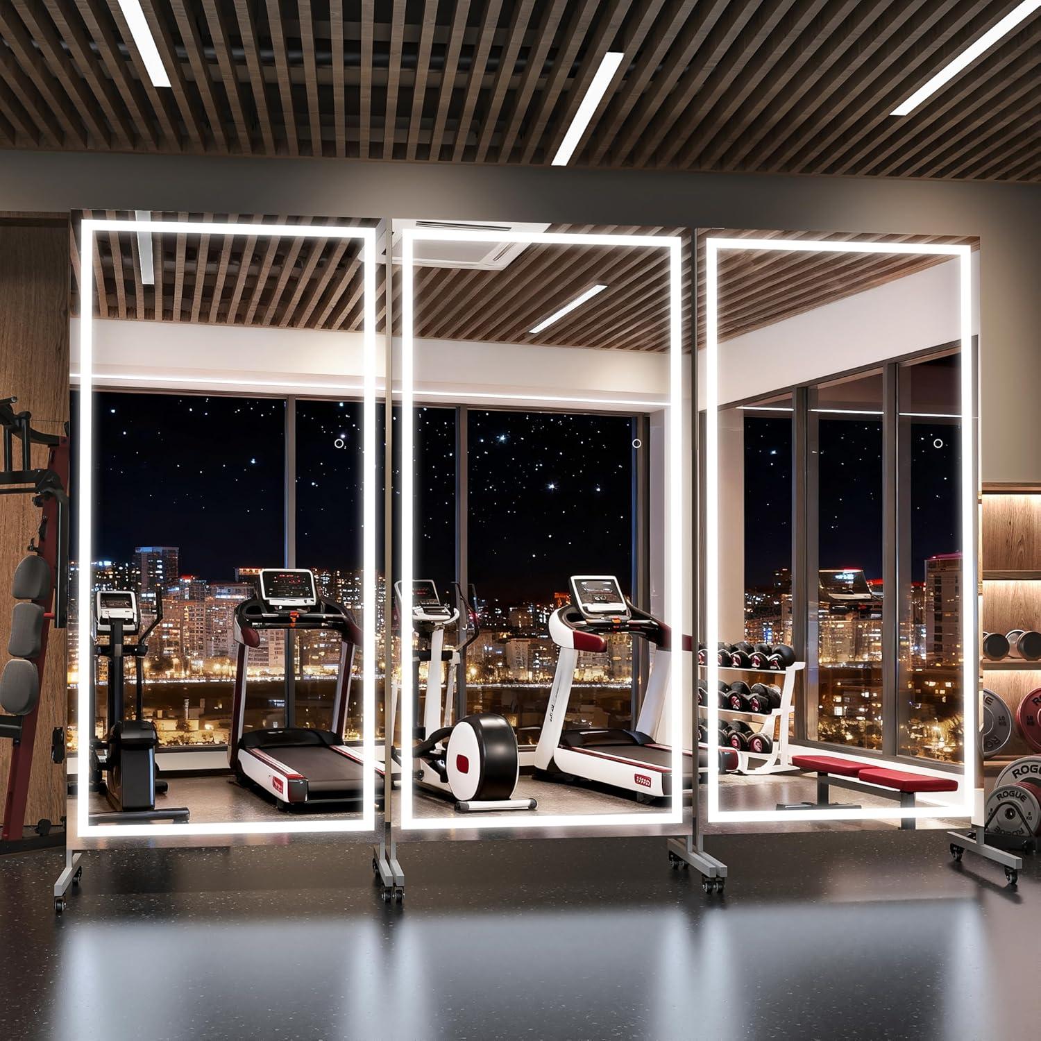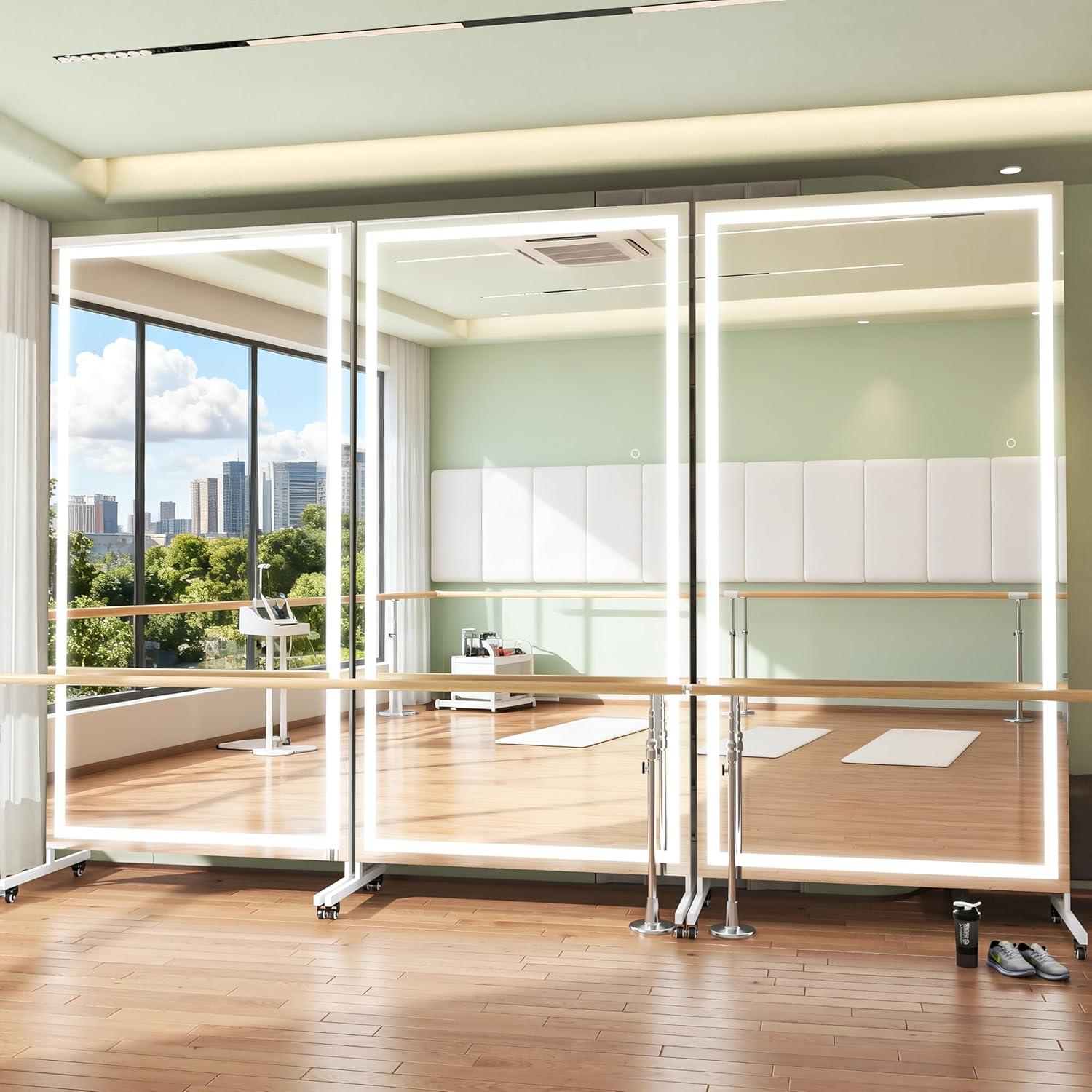 imageHasipu Home Gym Mirror 360 Swivel on Wheels 67quot x 40quot Extra Large Full Body Rolling and Tempered Glass Easy to Move Full Length Mirror for Yoga Studio Bedroom Dancing Studio WhiteWhite Led