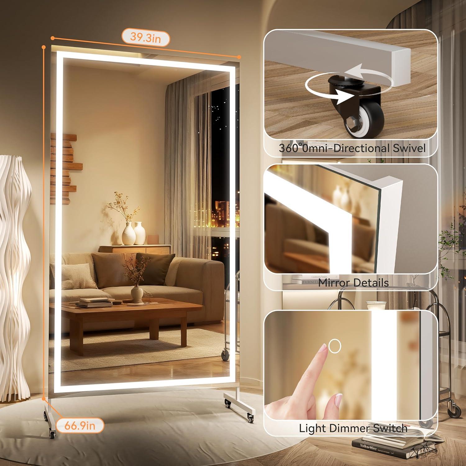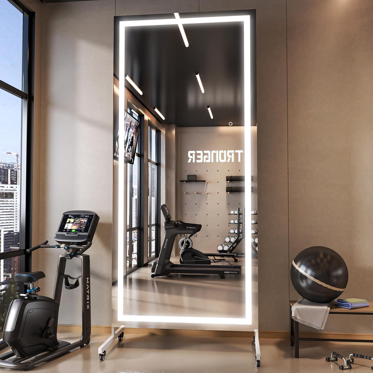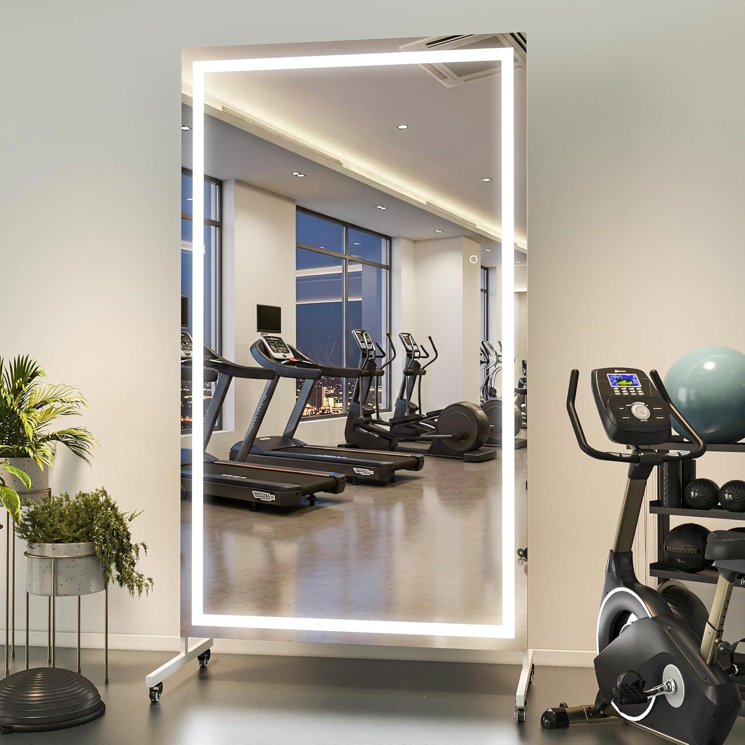 Hasipu Home Gym Mirror 360° Swivel on Wheels, 67" x 40" Extra Large Full Body Rolling and Tempered Glass Easy to Move Full Length Mirror for Yoga Studio, Bedroom, Dancing Studio, White(White/ Led)