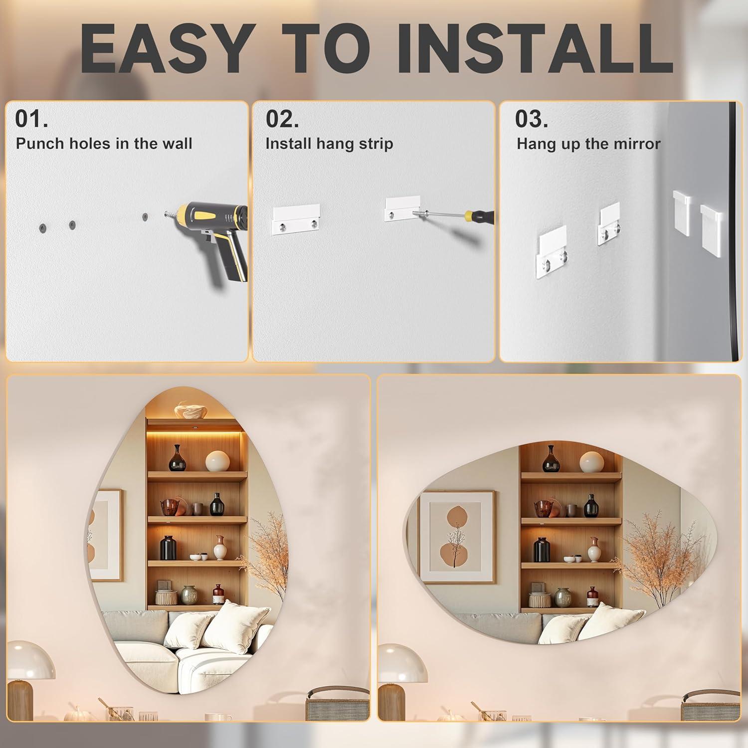 EASY TO INSTALL: Mount this wall-mounted modern mirror in minutes! 3 pre-attached hooks + dual hanging options require only two drill holes, secure the screws, and hang the irregular wall mirror effortlessly