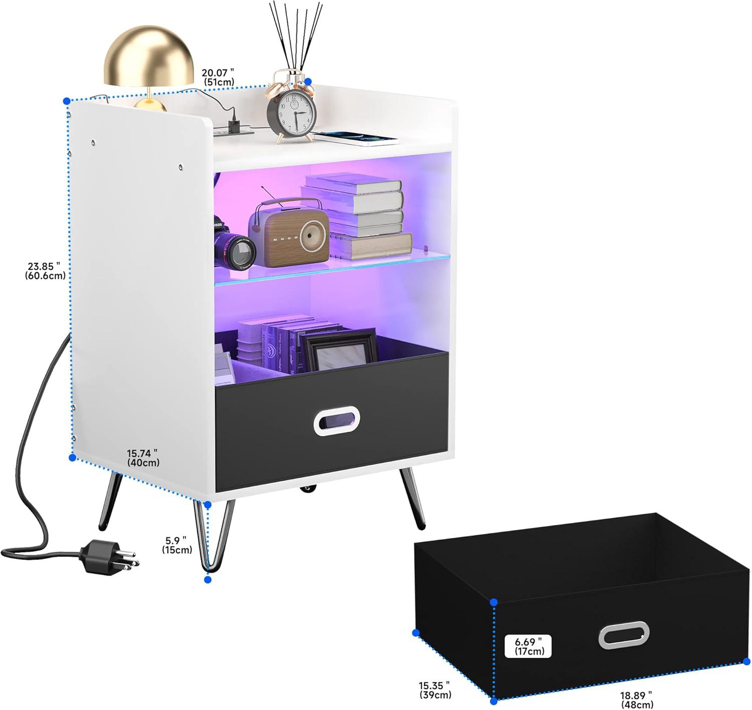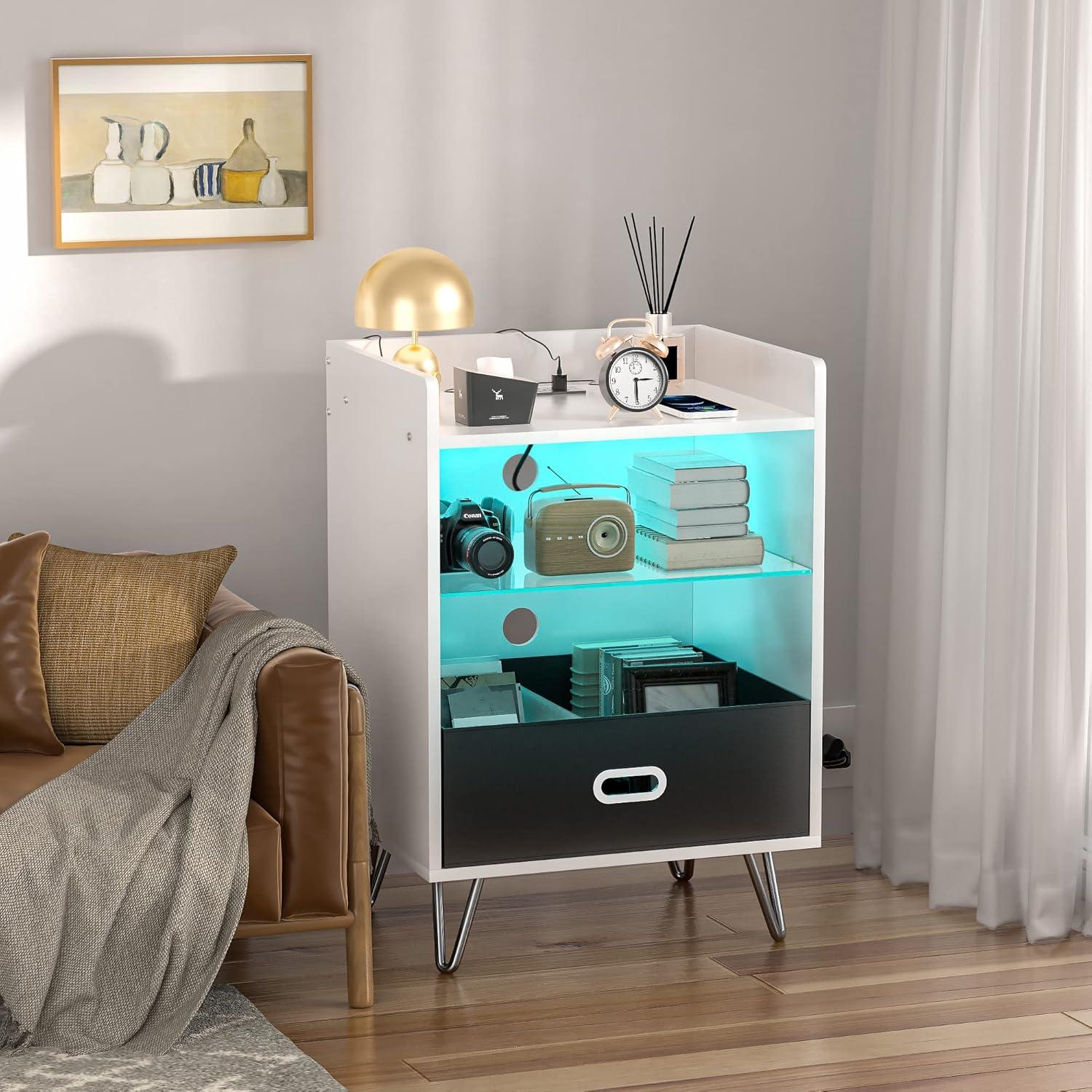 Hasipu LED Nightstand with Charging Station for Bedroom,White Smart Bedside End Table with USB and Storage Drawer