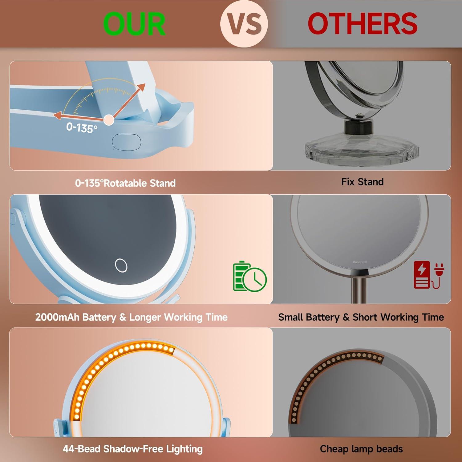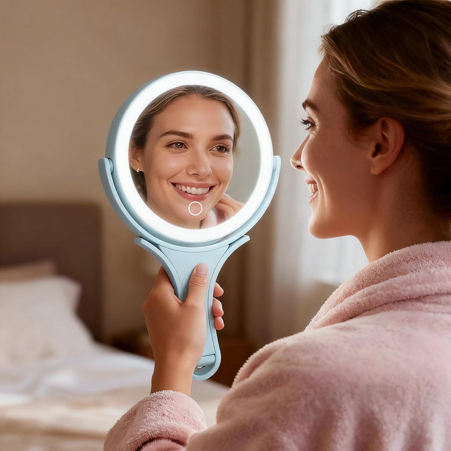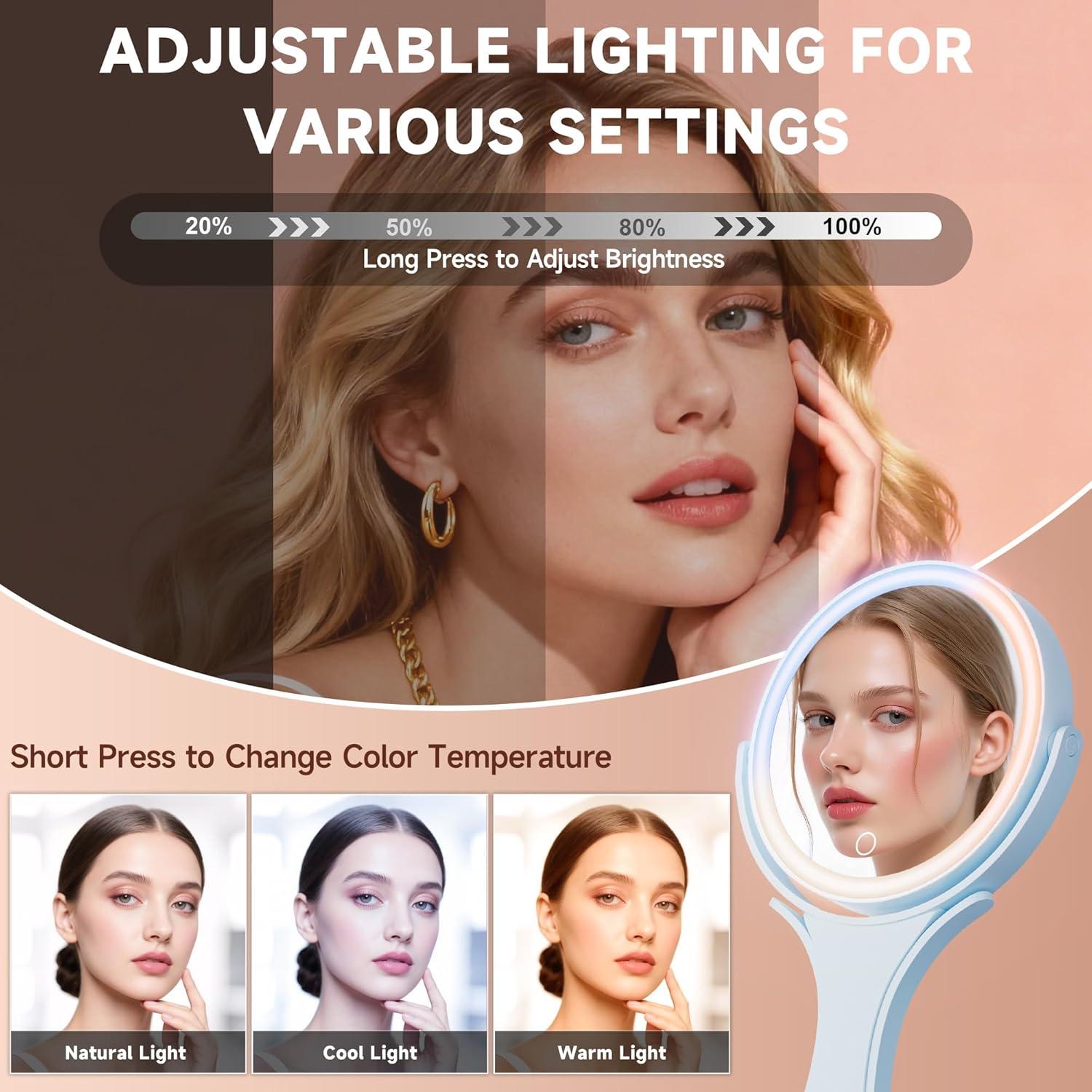 Hasipu Travel Makeup Mirror with Lights, 1X/10X Double-Sided Magnifying, Rechargeable Beauty Mirror with 3 Color Lights & Touch Control, Portable 3 in 1 Vanity Mirror Tabletop Handhold Hanging (Blue)(Blue)