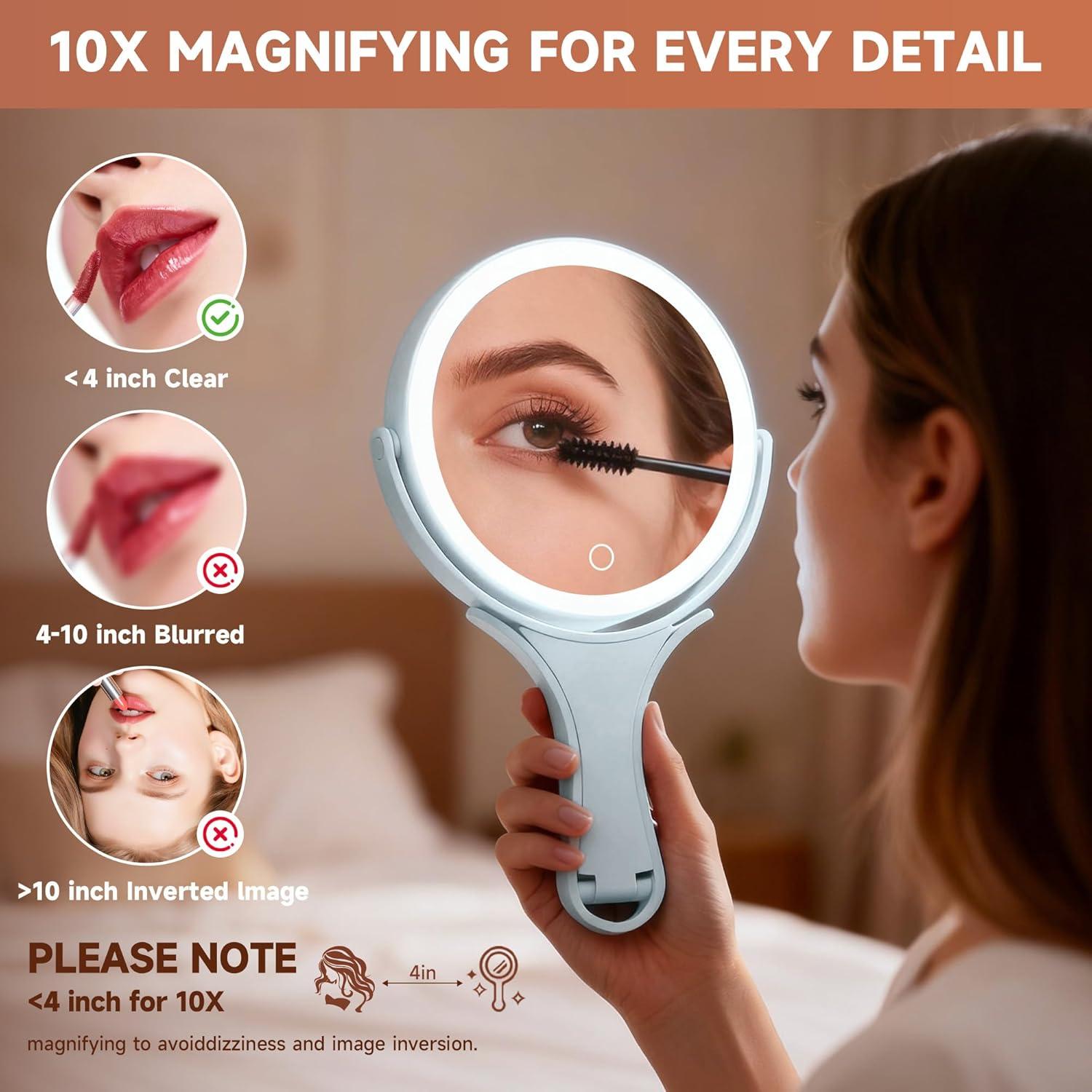 1X/10X Double-Sided Magnification:Achieve salon-level results with this travel magnifying mirror. The 1X side is ideal for daily makeup, while the 10X magnifying side lets you handle intricate details like eyebrow shaping or skincare up close—ideal as a travel mirror with magnification for those on the move. This handheld mirror ensures crystal-clear vision for all users, making it a must-have tool for precision grooming. ( Note: For best use of the 10X side, keep it within 4 inches)