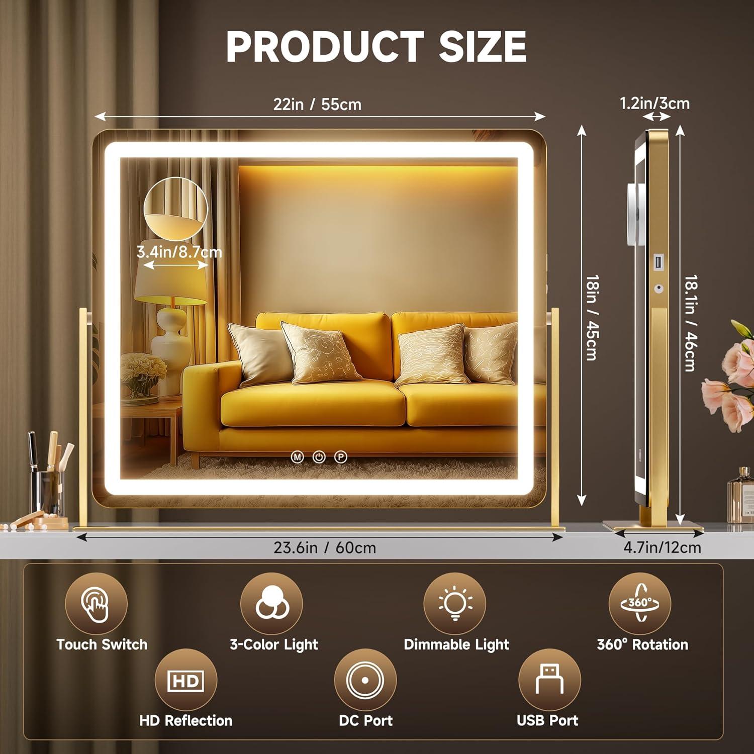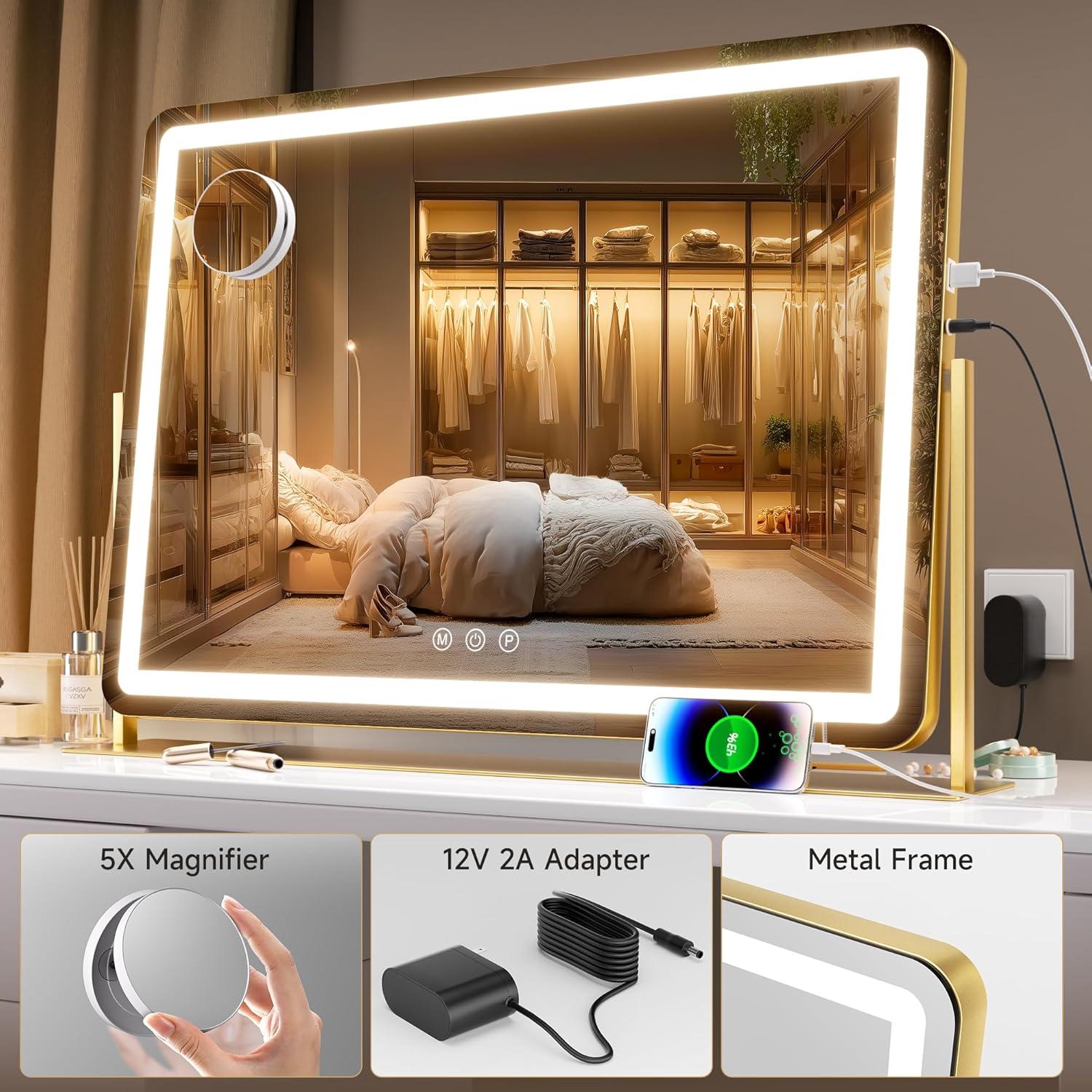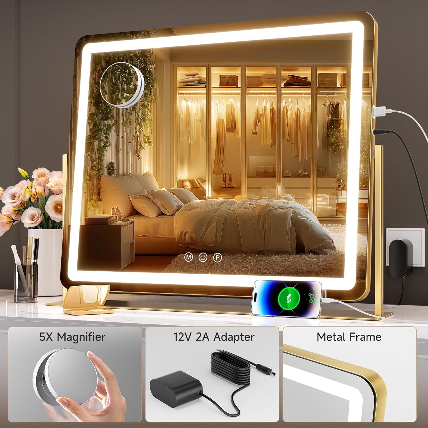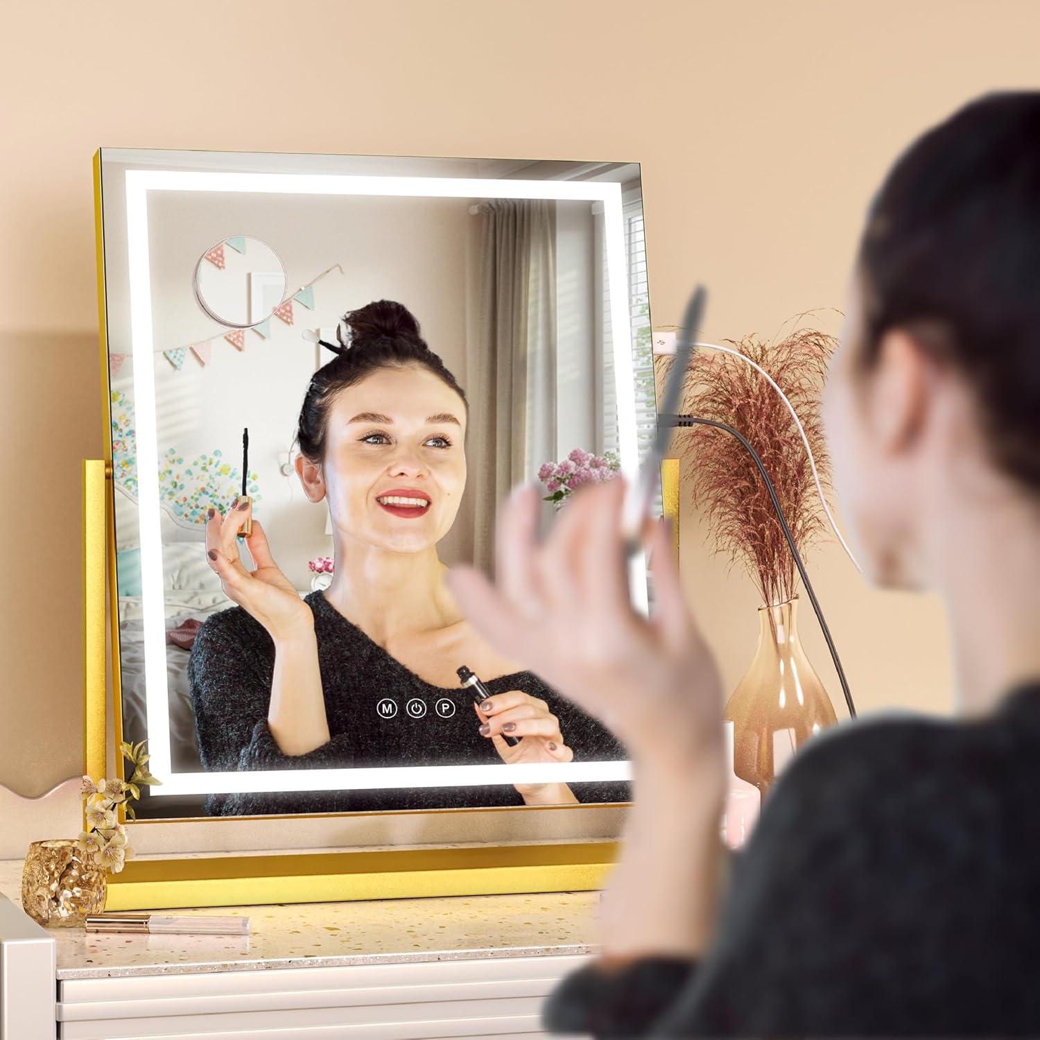 Hasipu Vanity Mirror with Lights, 12" x 14" LED Makeup Mirror, Light up Mirror with Smart Touch 3 Color Modes and Brightness Adjustment, 10X Magnifying Glass,360° Rotation(Gold)