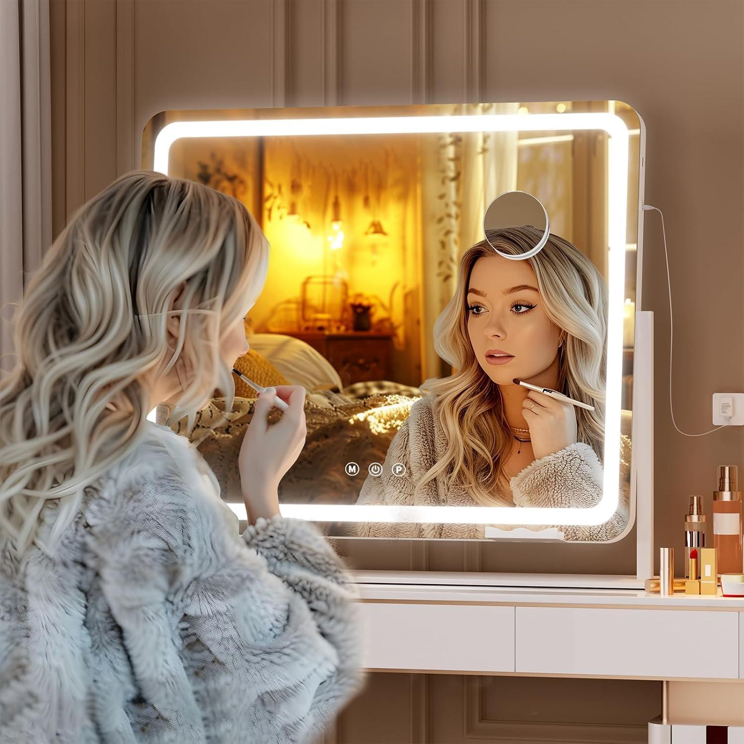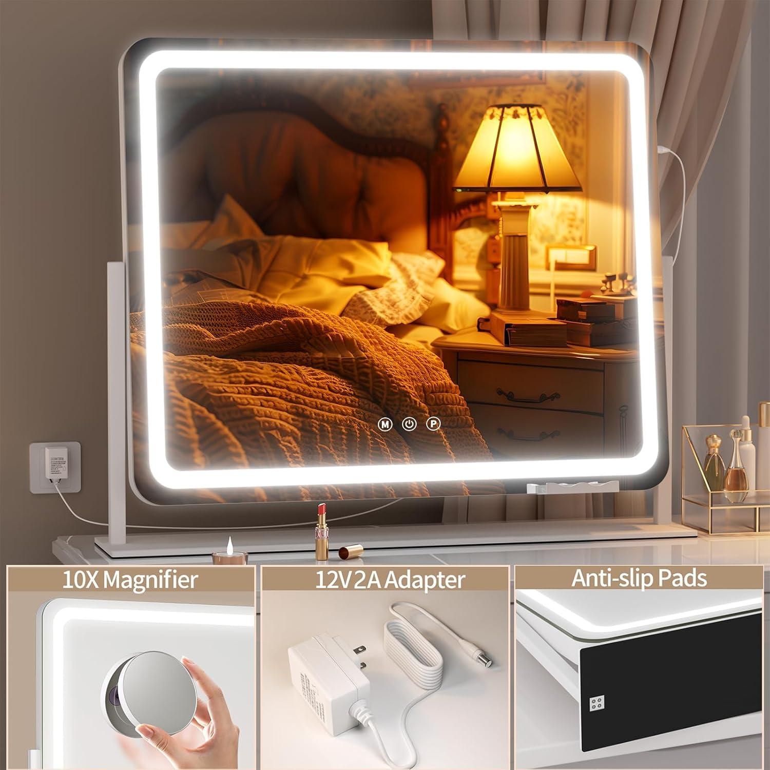 Hasipu Vanity Mirror with Lights, 12″ x 14″ LED Makeup Mirror, Light up Mirror with Smart Touch 3 Color Modes and Brightness Adjustment, 10X Magnifying Glass,360° Rotation(White)
