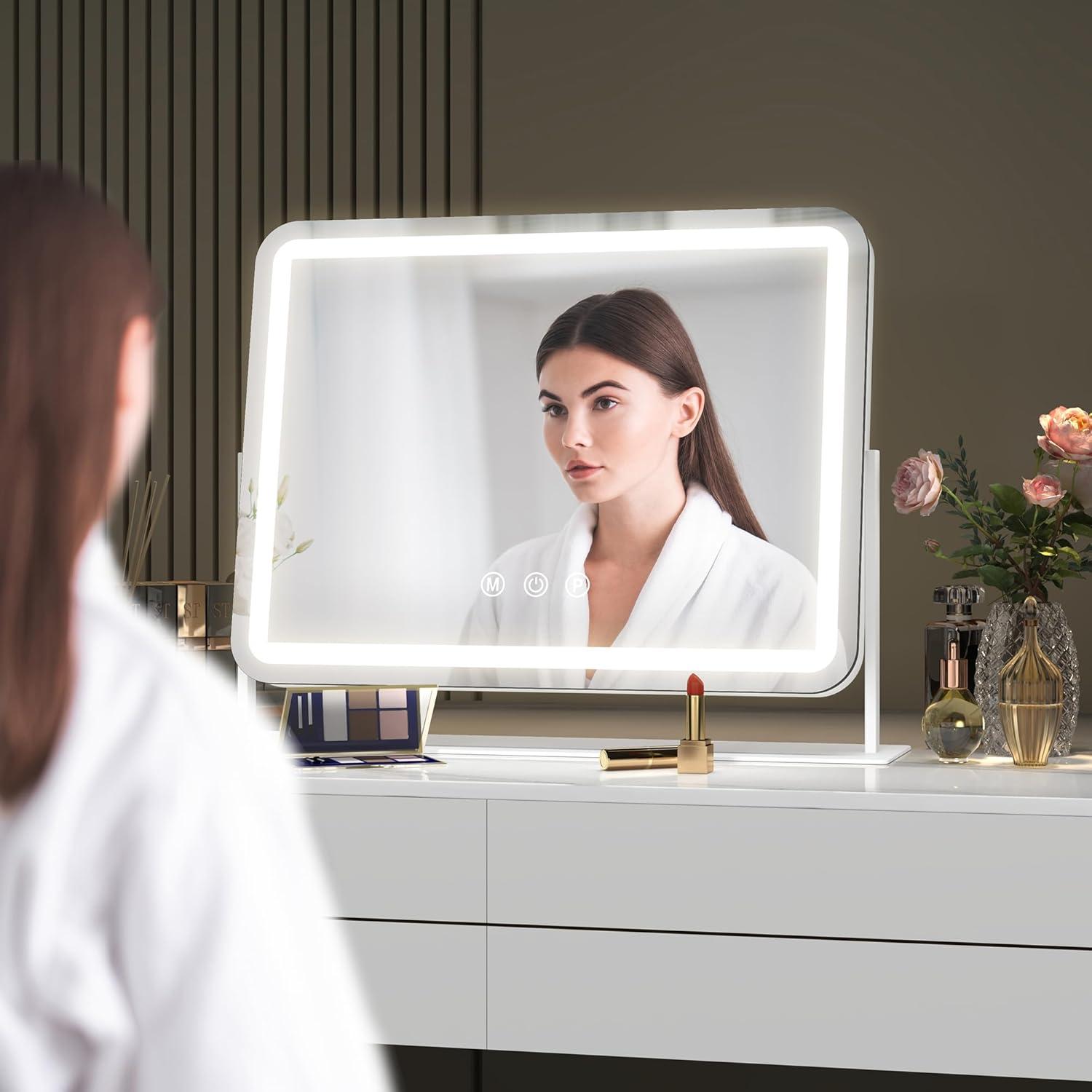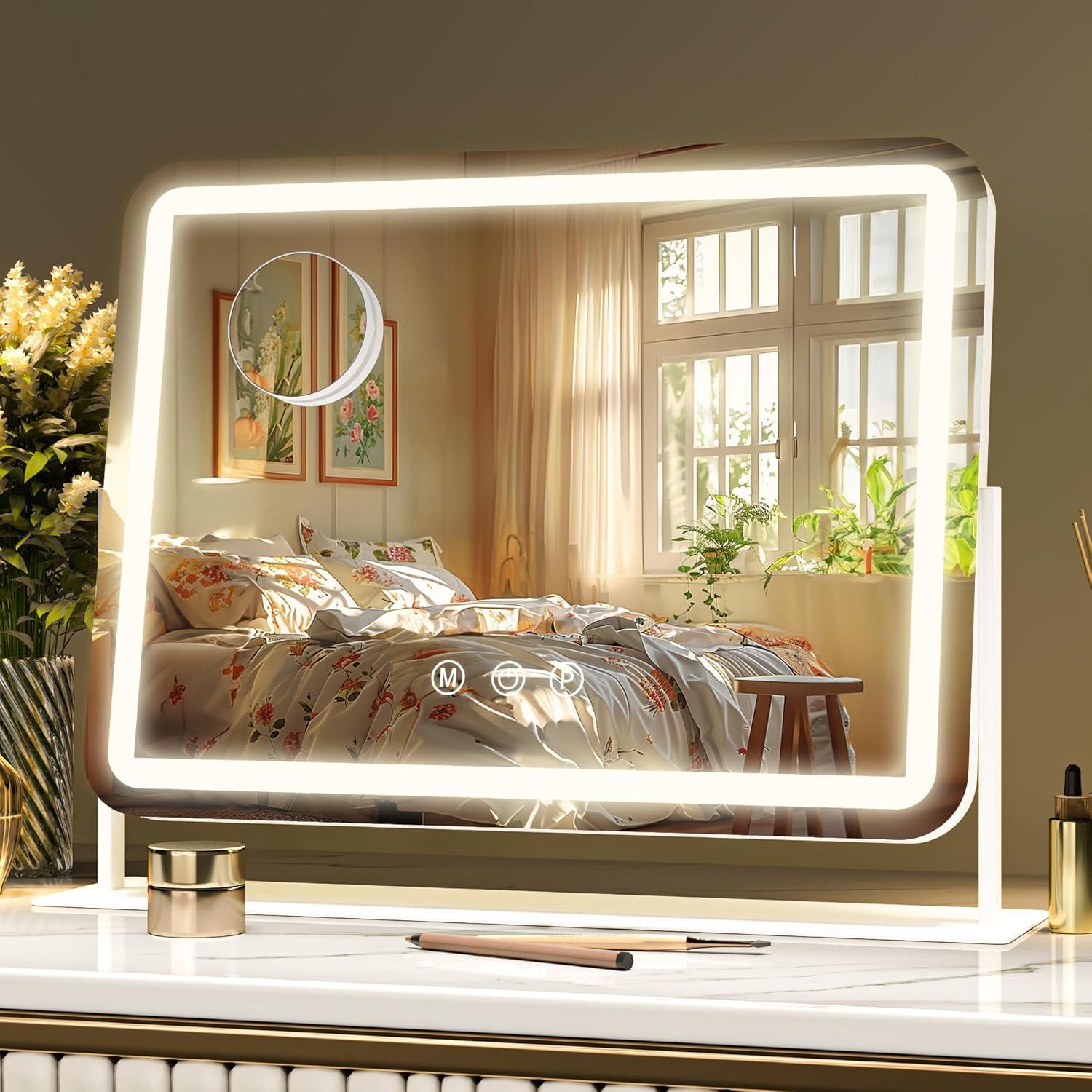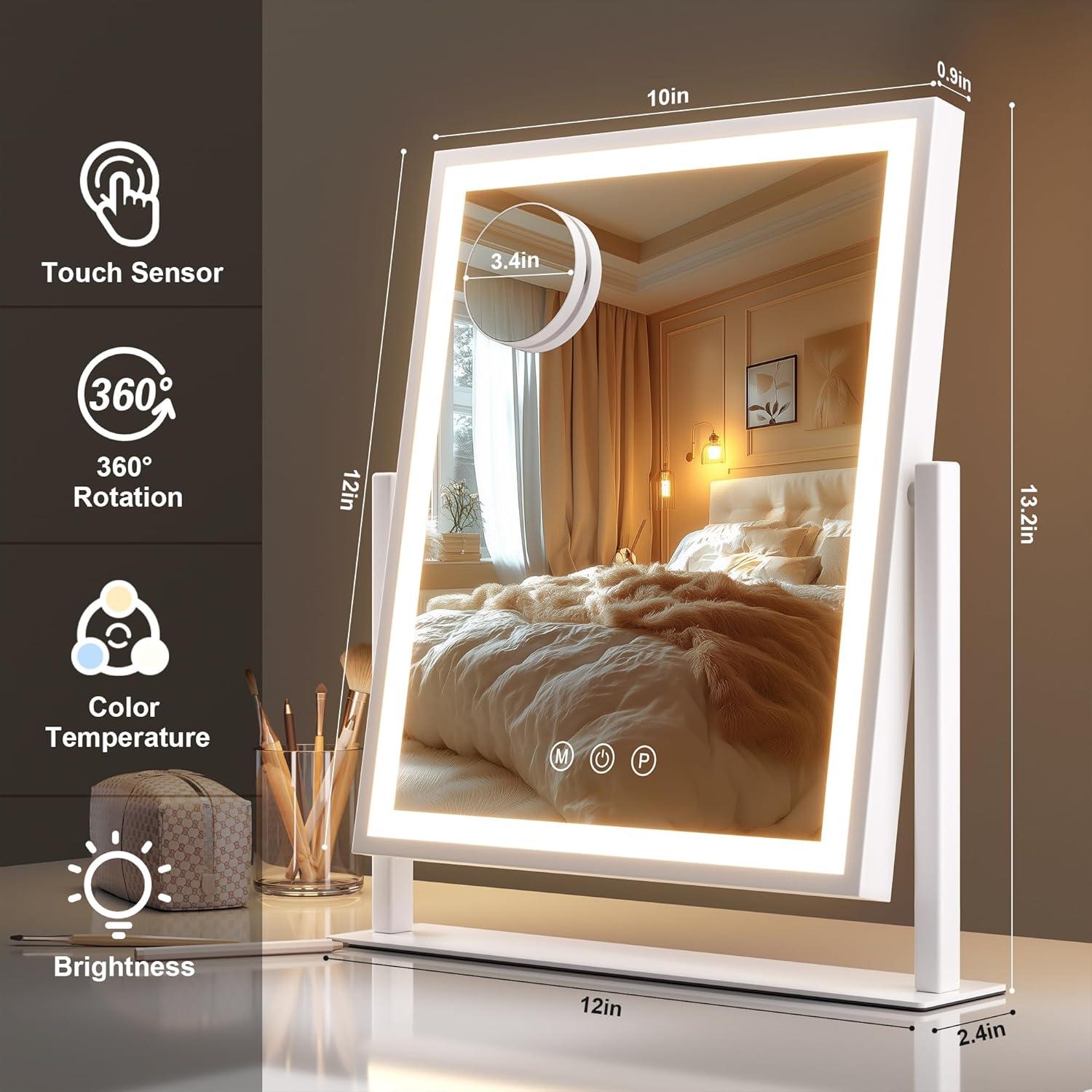 Hasipu Vanity Mirror with Lights, 12" x 14" LED Makeup Mirror, Light up Mirror with Smart Touch 3 Color Modes and Brightness Adjustment, 10X Magnifying Glass,360° Rotation(White)