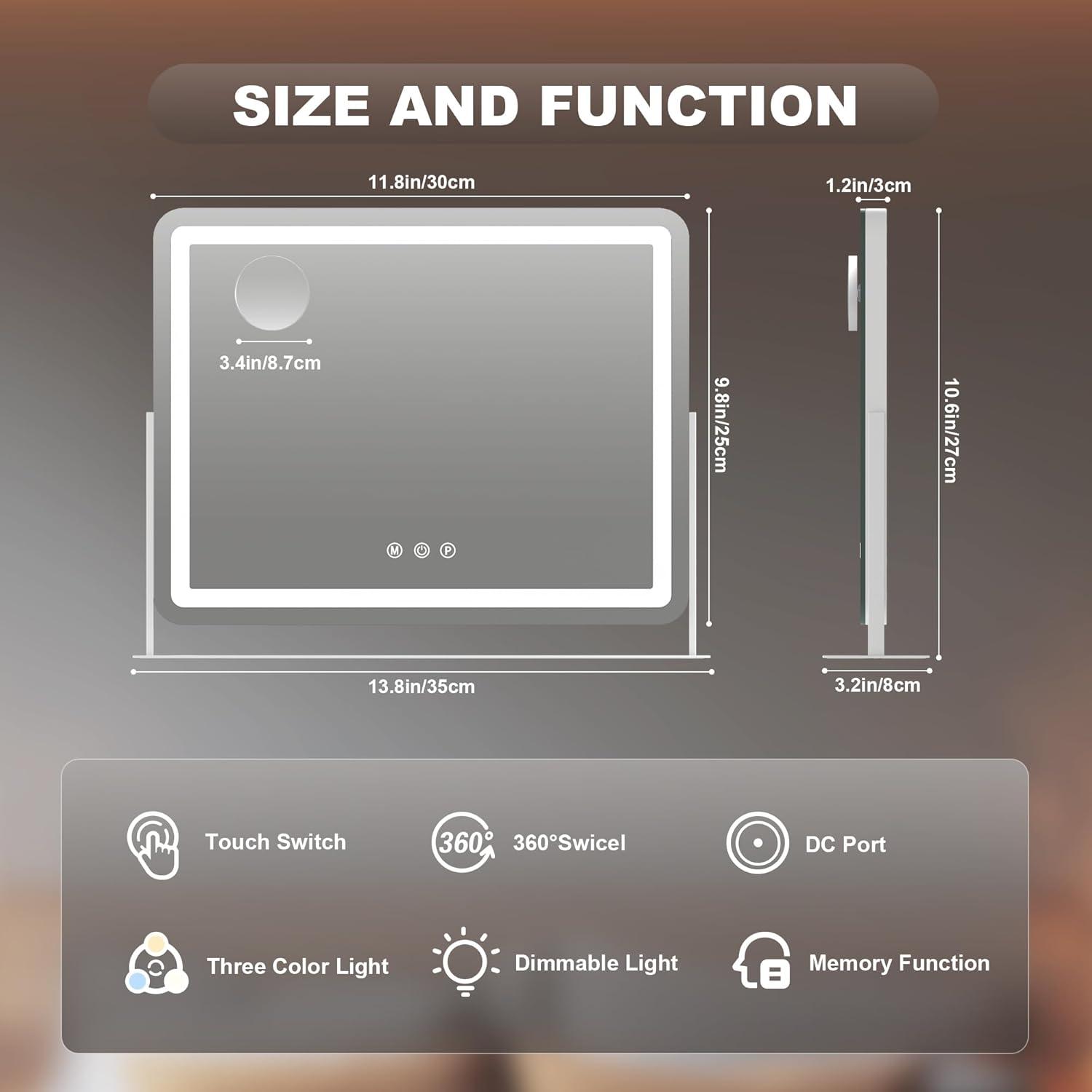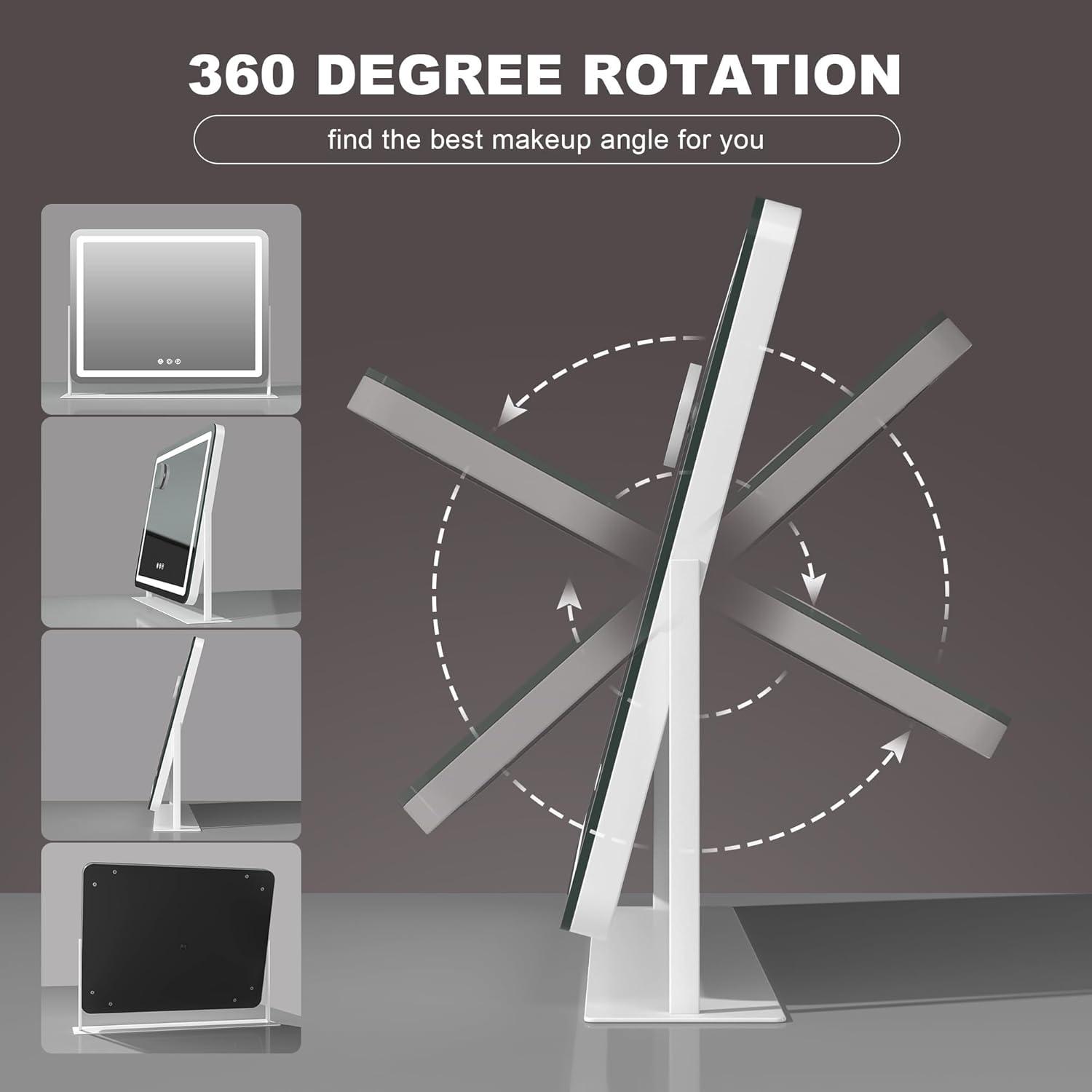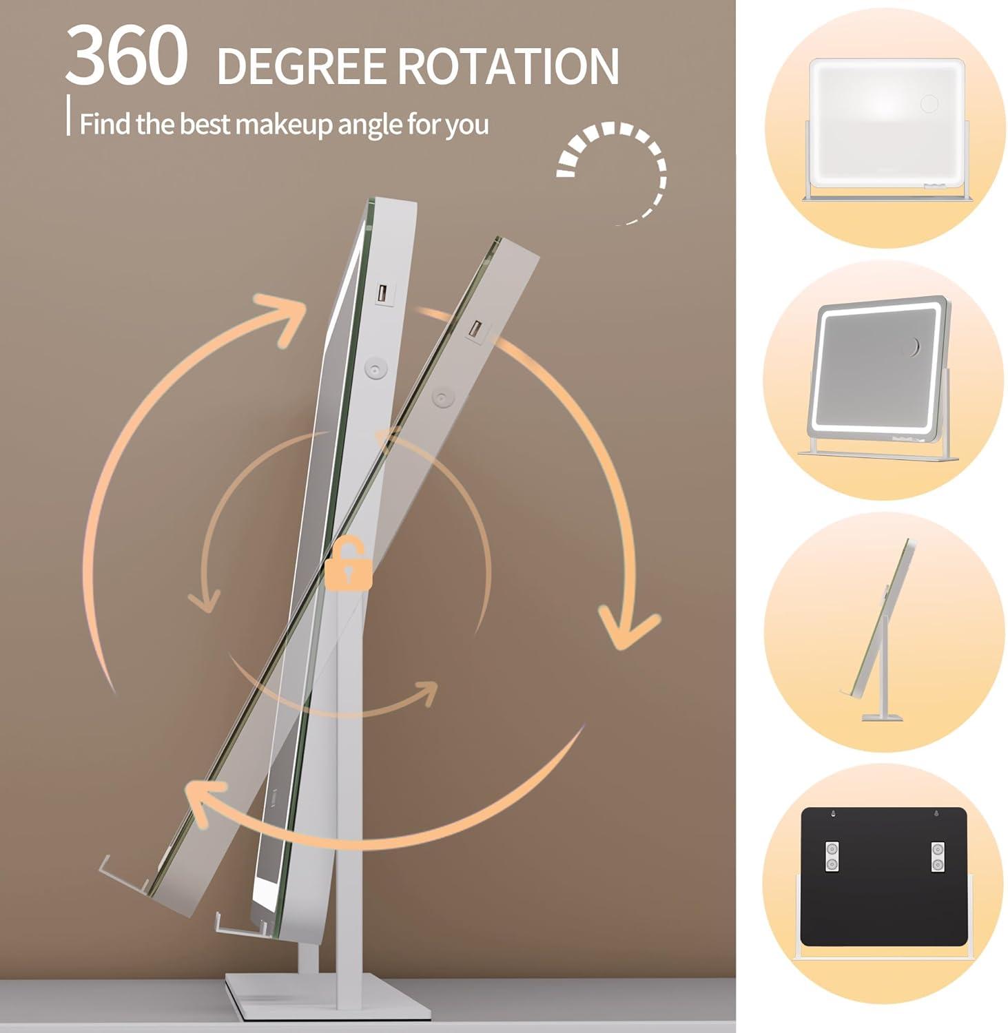 【Humanized Design】Can 360° rotate led makeup mirror effortlessly adjust the angle of the mirror by smoothly rotating and stabilizing the base frame to ensure you get the best view every time. The vanity mirror measures 10″ x 12″for a perfect upper body view.