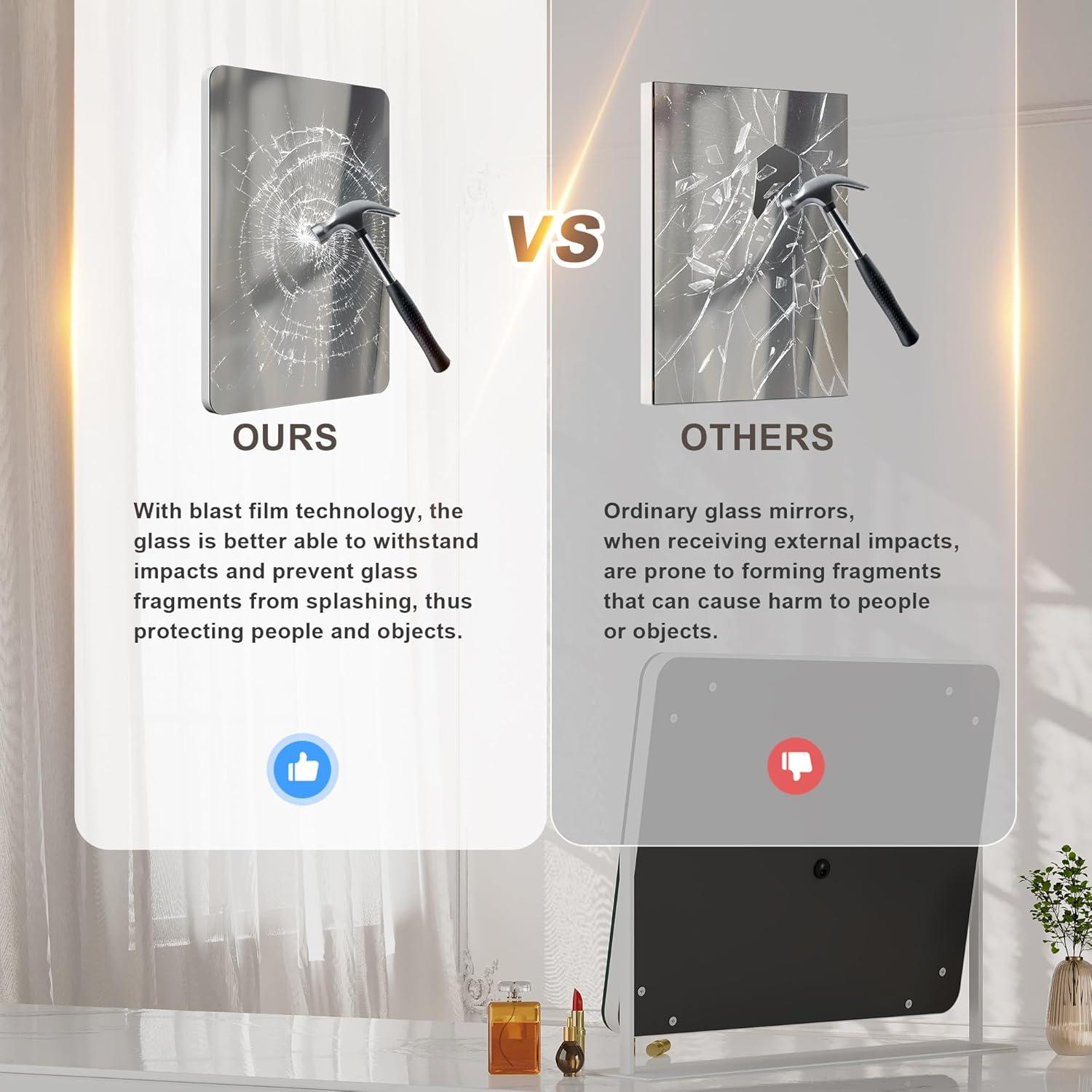 【Aluminum Alloy Frame and High-Quality LED Light Strip】The metal frame and base structure are stable. The mirror is made of high-quality materials, with a mirror thickness of 3mm, which is safe to use, with clear mirror reflection and especially not easy to distort. LED lamp beads, 180 per meter, lifespan up to 50,000 hours; no need to replace the light strip.