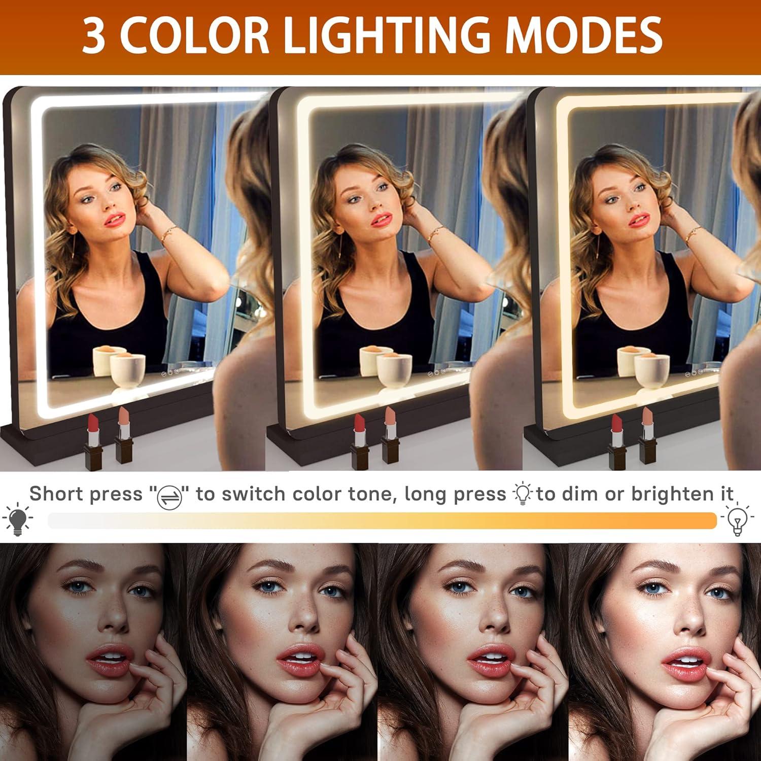👍【Smart Touch Control & Memory Function】This makeup mirror with lights has 3 smart touch buttons, turn on/off the light by touching the sensor switch, Press left button to change the color modes, long press right button to adjust the led brightness. This lighted makeup mirror is specially designed memory functionfunction keep your lights setting like your last use.