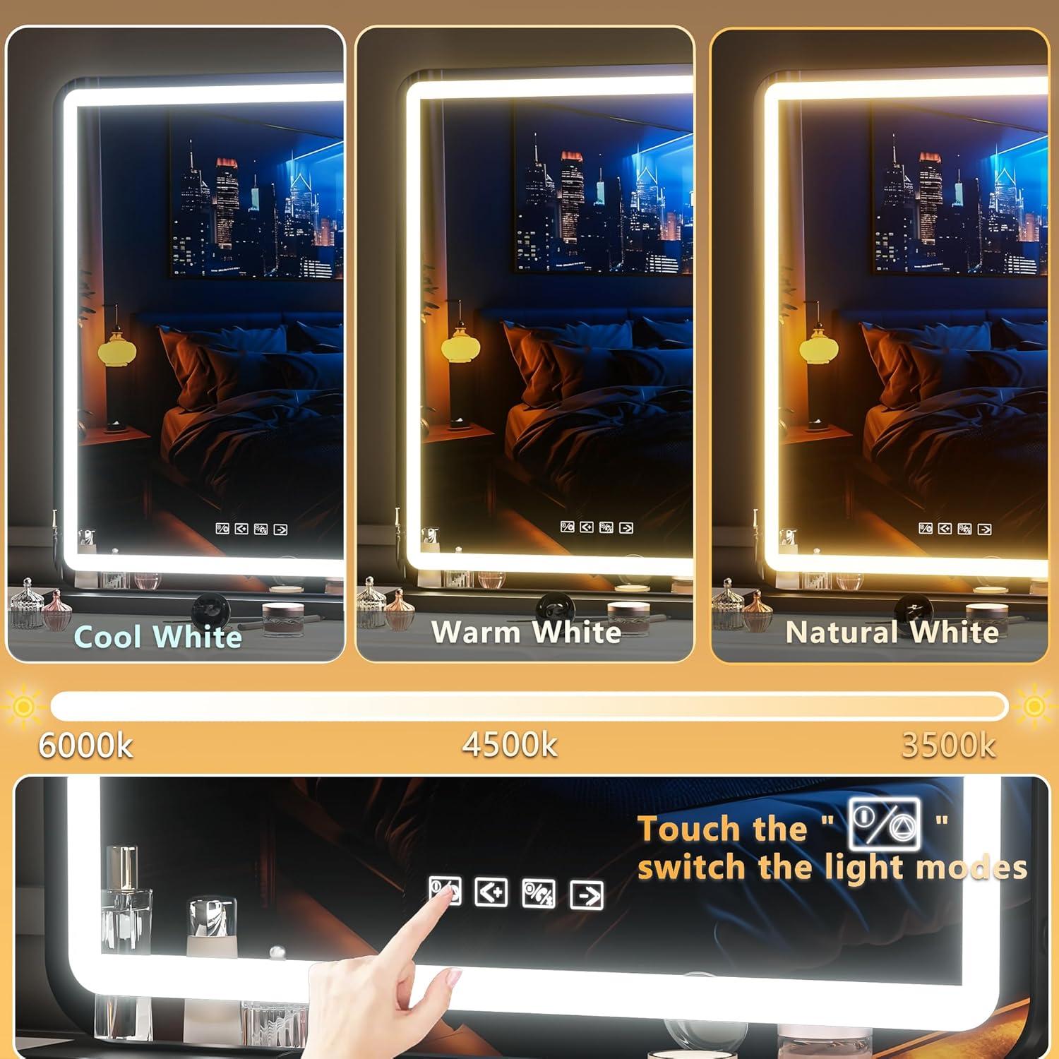 👍【Brightness Adjustable and 3 Color Lighting Modes】HASIPU lighted makeup mirror surrounded by 50,000 hours life Max 6000 Lumens high brightness LED Light Strip, with warm /natural /cold white three-tone settings, adjustable brightness 0%-100% can meet your personal makeup requirement.