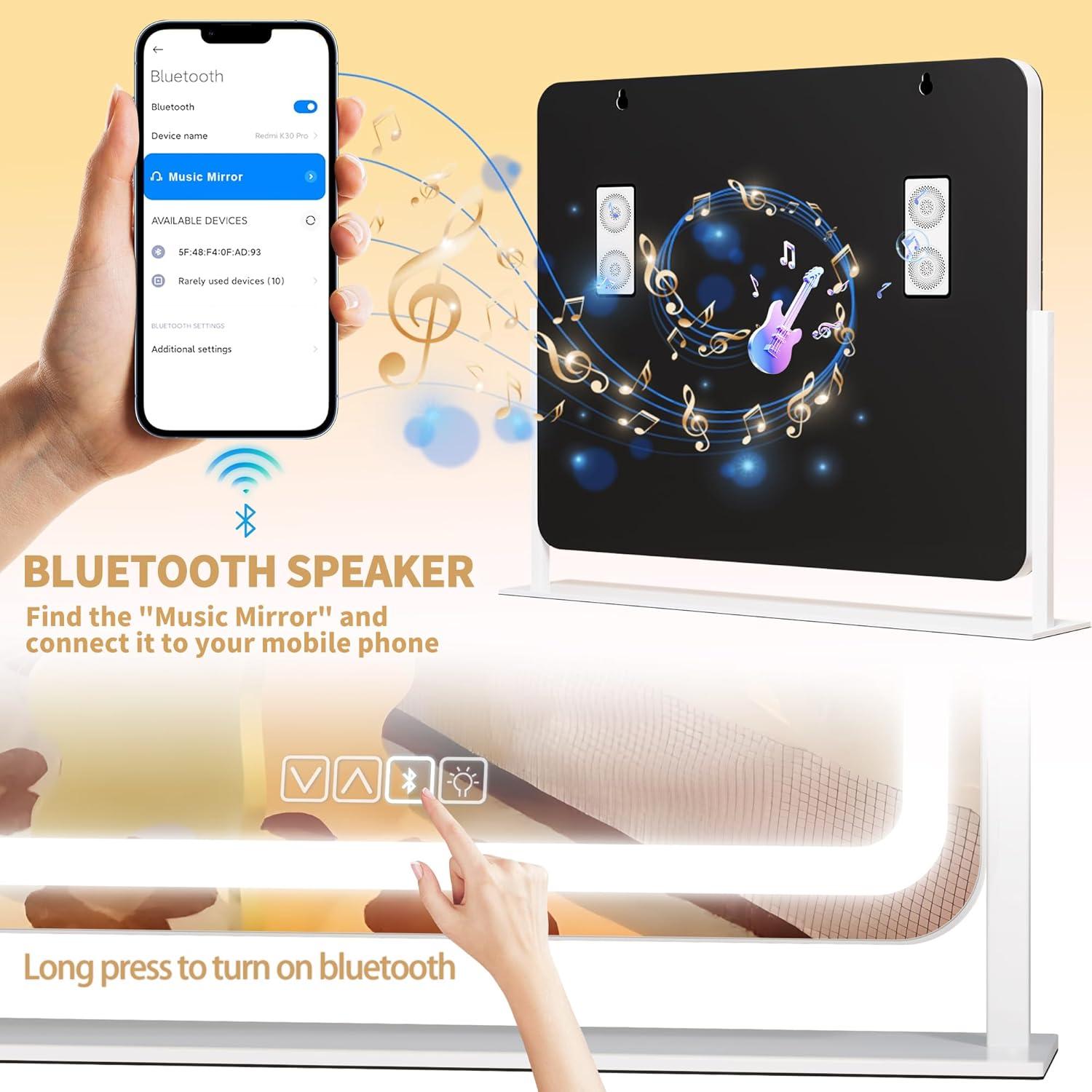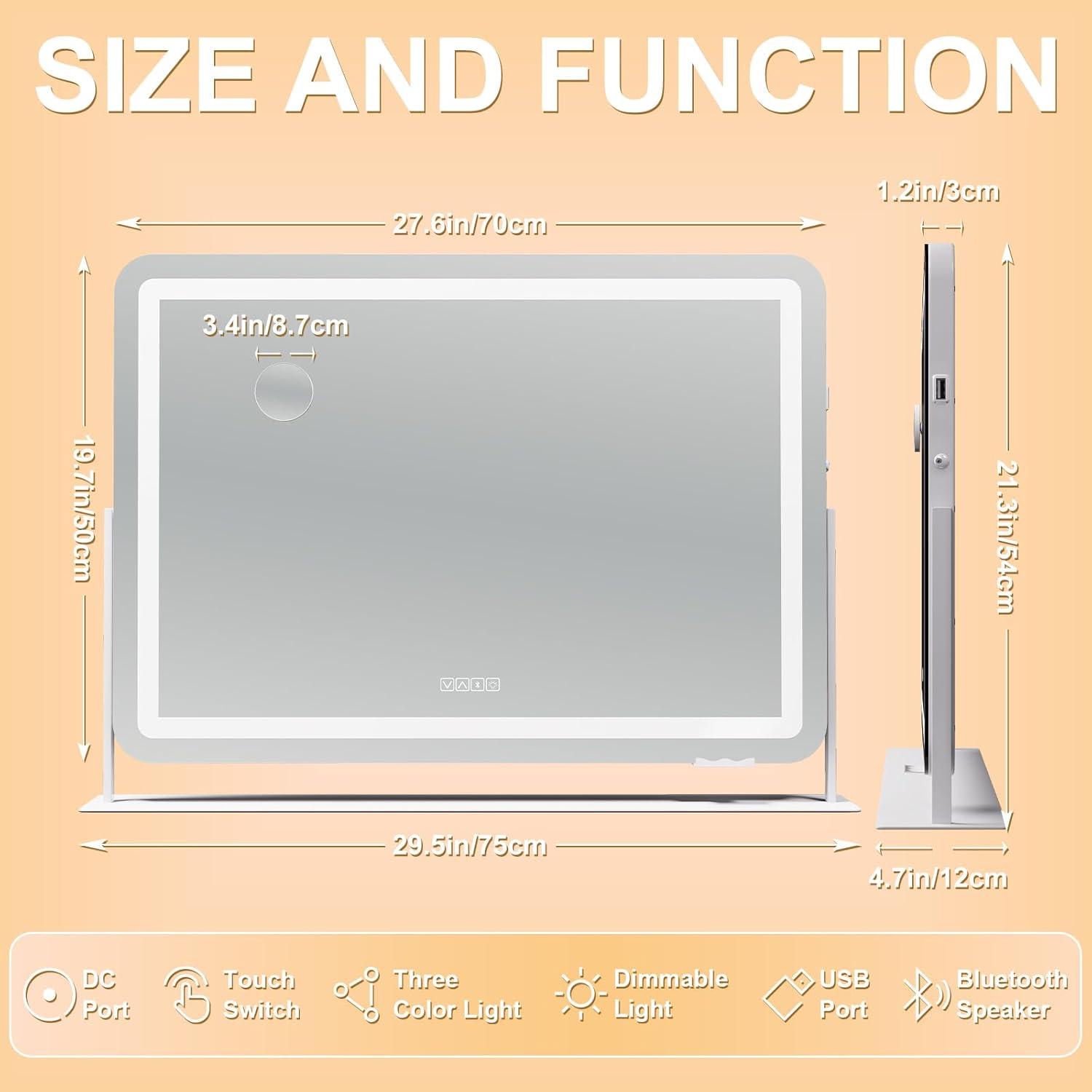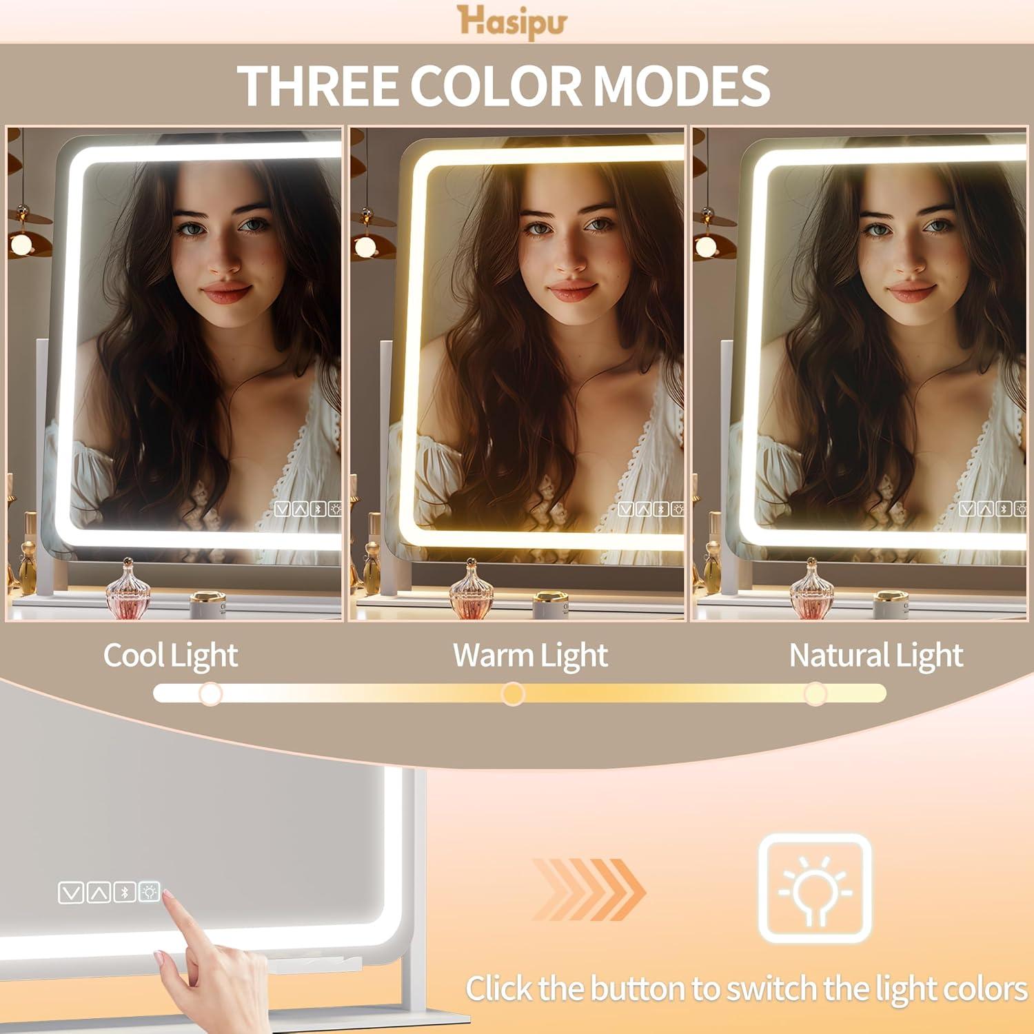 Hasipu Vanity Mirror with Lights and Bluetooth Speaker, 16.9" x 13.4" LED Makeup Mirror, Light up Mirror with 10X Magnification, Smart Touch 3 Colors Dimmable, Brightness Adjustment (White)(28"L x 20"W)